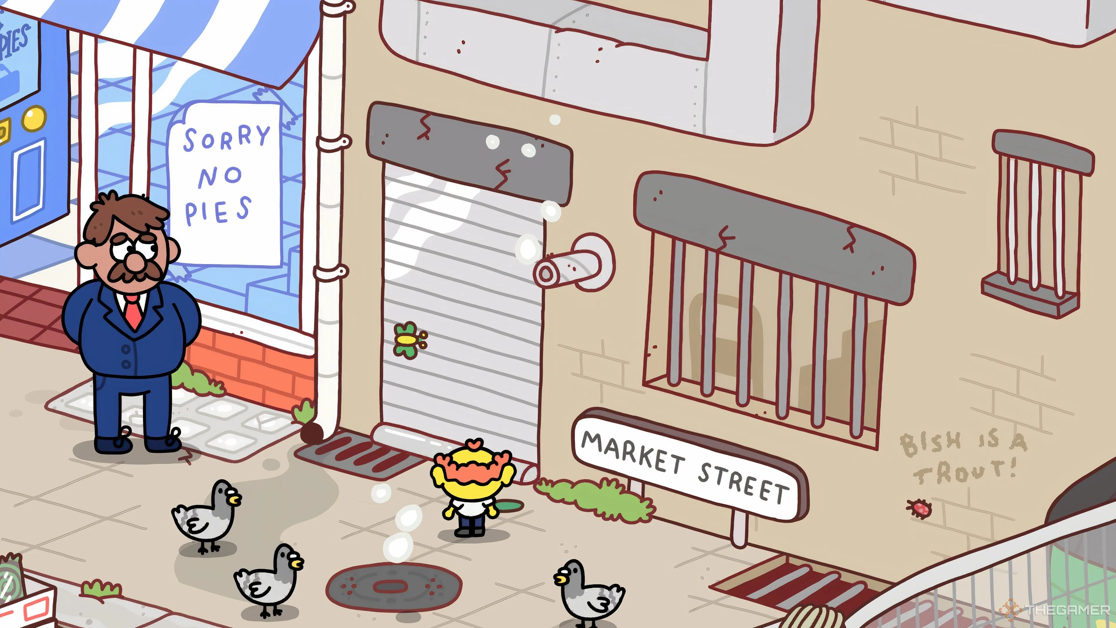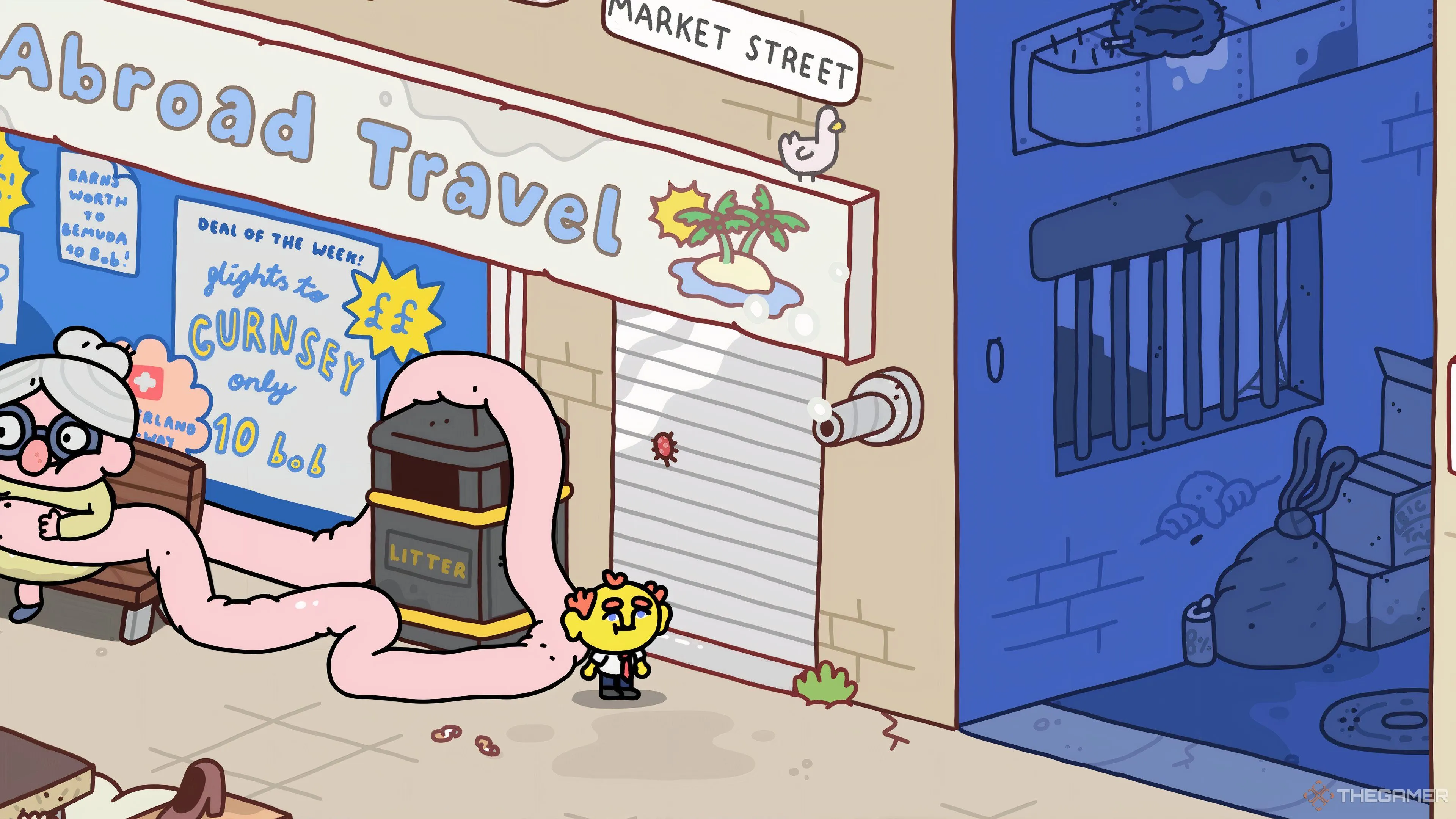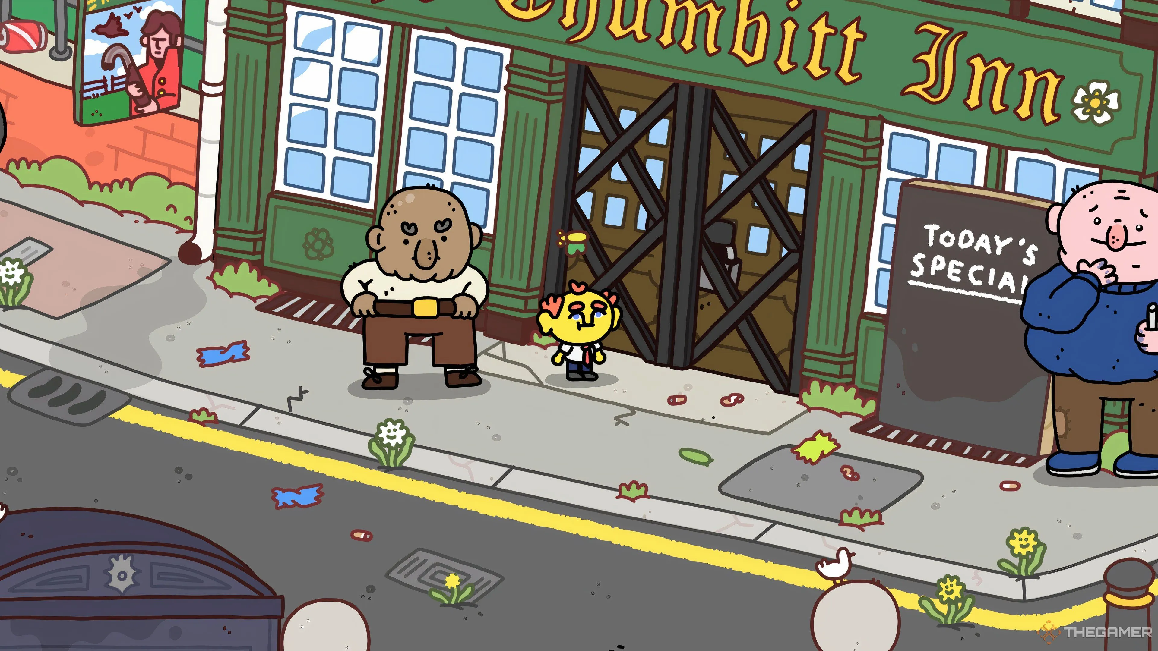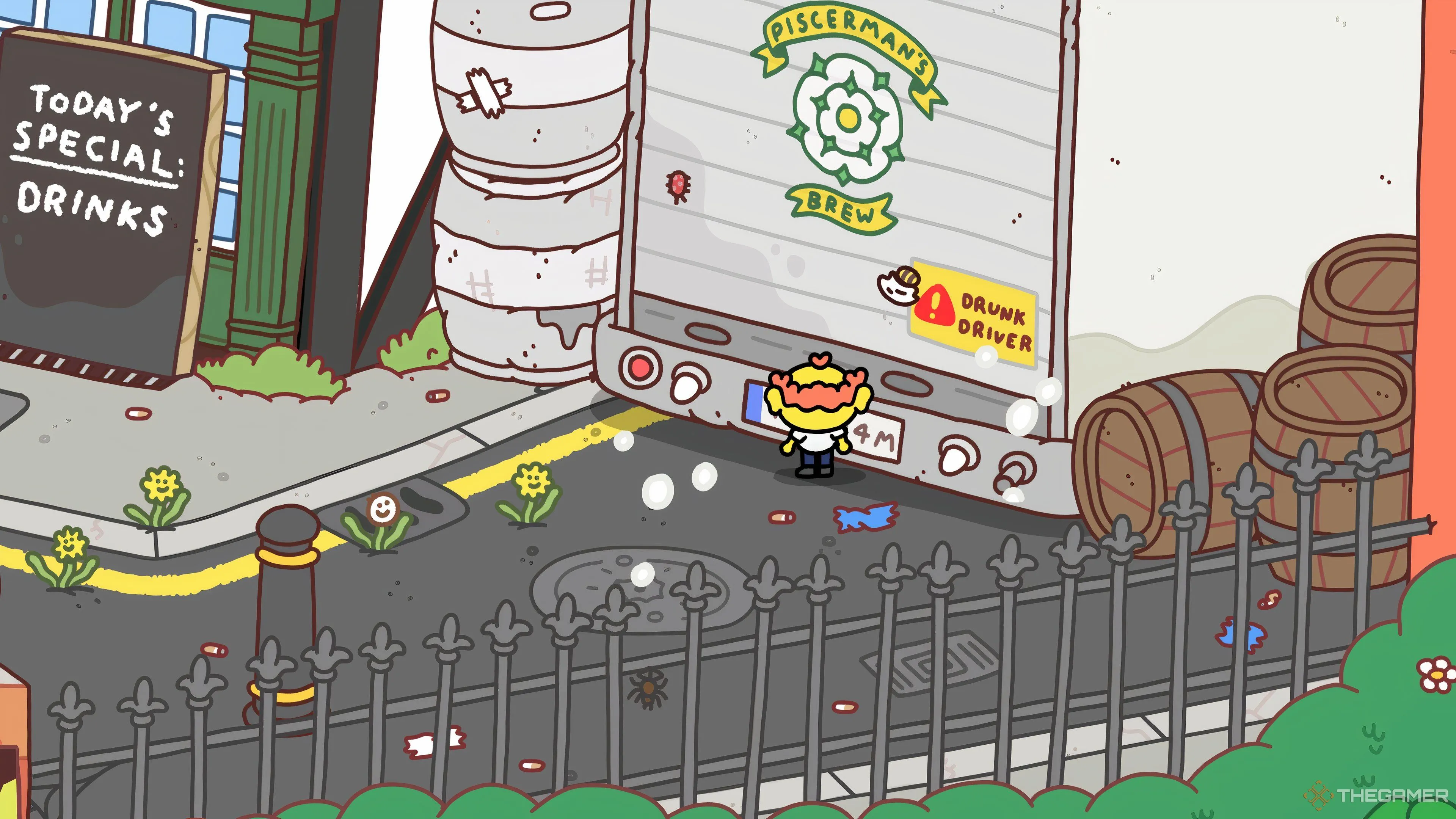 После того, как вы поговорите с Роном из «Больших пирогов Большого Рона», школьная машина водителя выедет из задней части Маркет-стрит, открывая за собой переулок. Спуститесь по переулку, пройдите мимо человека, который ловит рыбу, и парня, предупреждающего вас о желтых цветах. Вы выйдете через сарай для шин и пойдете на север.