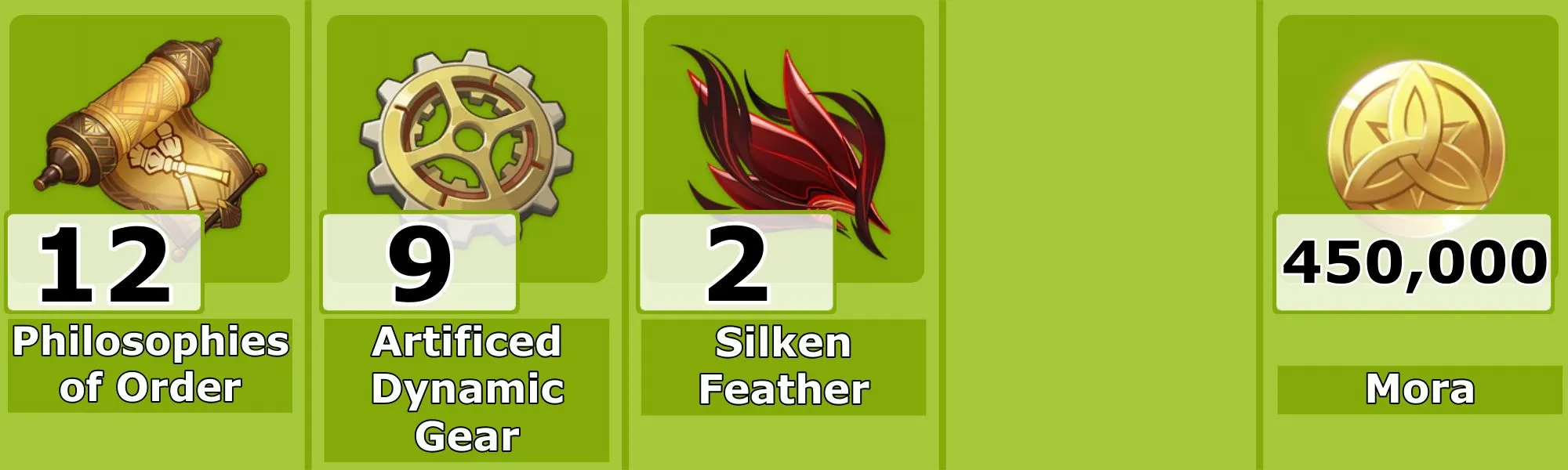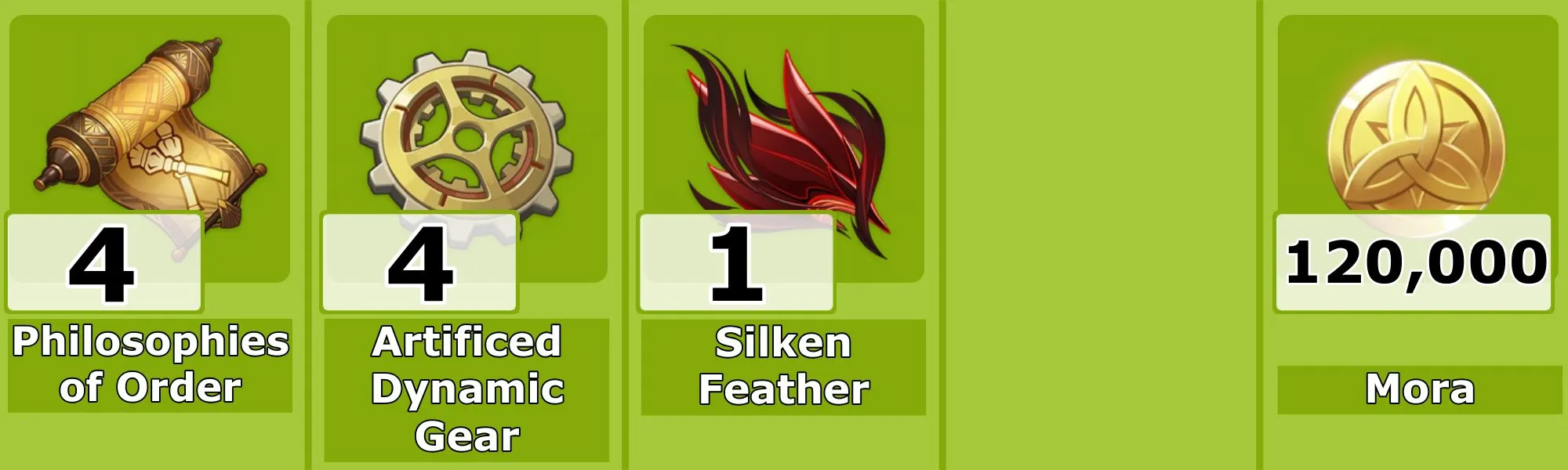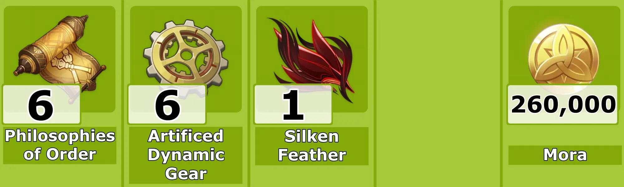 | 6-7 | 4x Философии порядка | 4 искусственных динамических механизма | 1x шелковое перо | - | 120 000 |