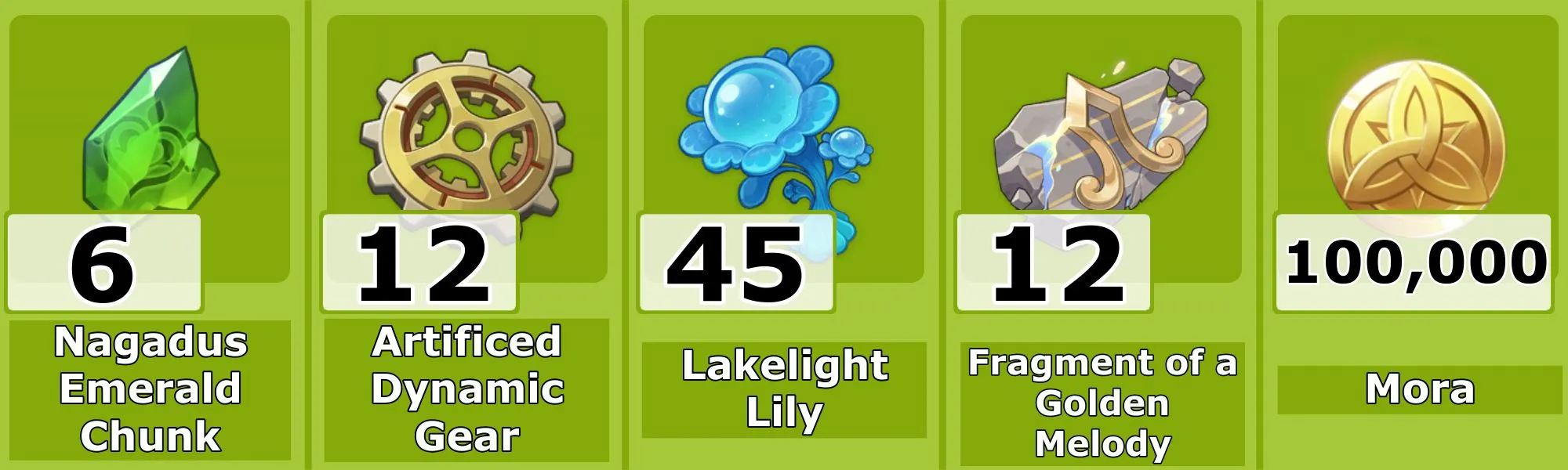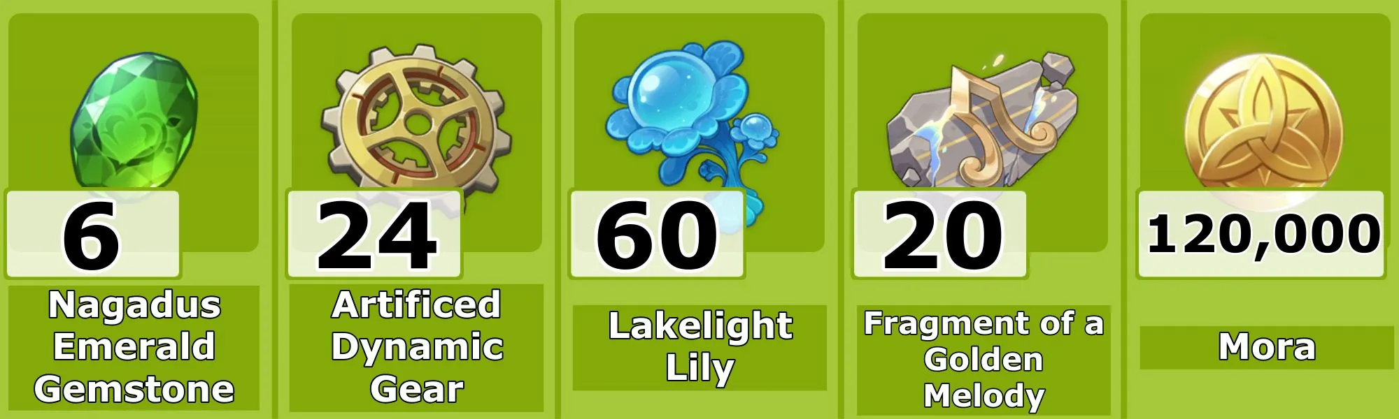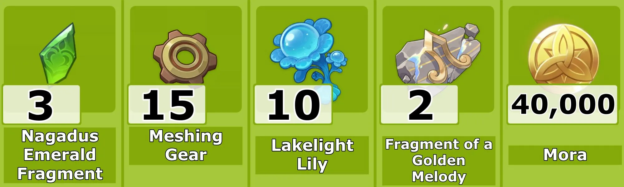 | 60 | 3x Кусок изумруда Нагадуса | 18 механических цилиндрических шестерен | 8x Фрагмент золотой мелодии | 30x Озерная лилия | 80 000 |