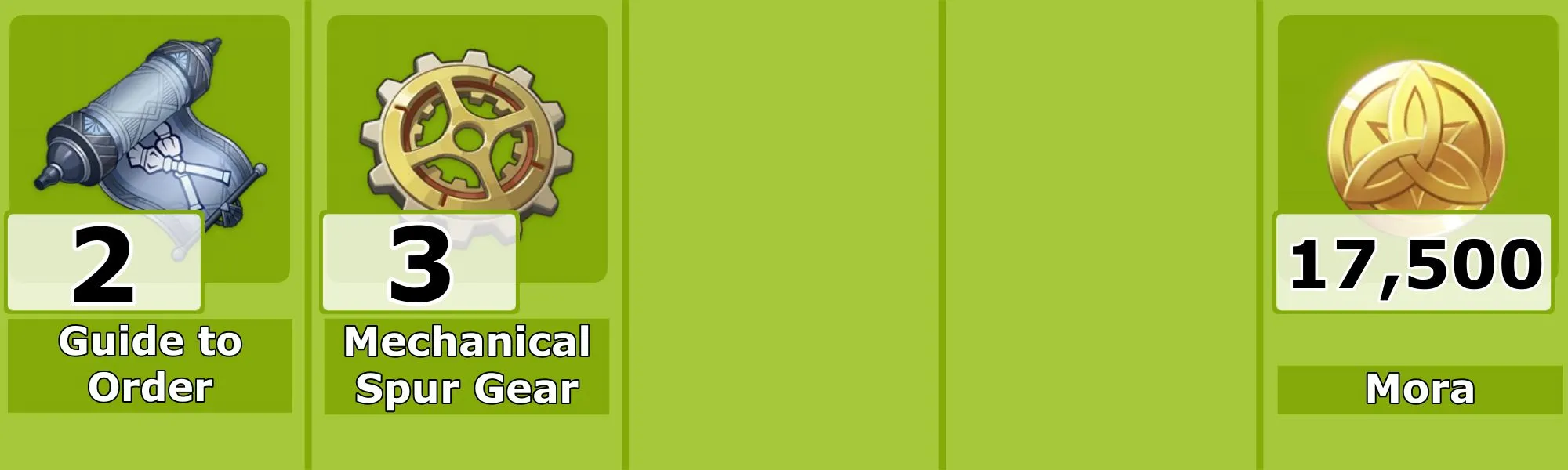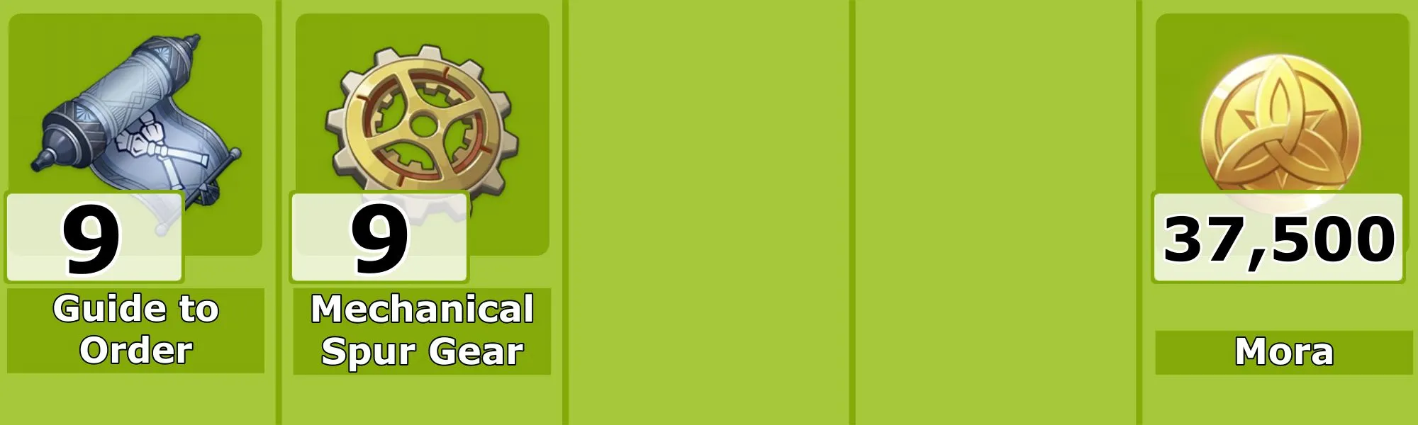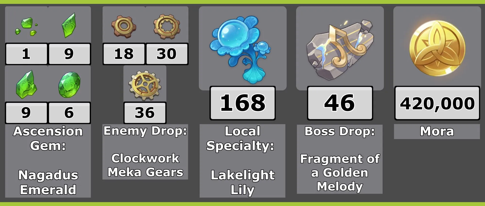 | 60 | 3x Кусок изумруда Нагадуса | 18 механических цилиндрических шестерен | 8x Фрагмент золотой мелодии | 30x Озерная лилия | 80 000 |