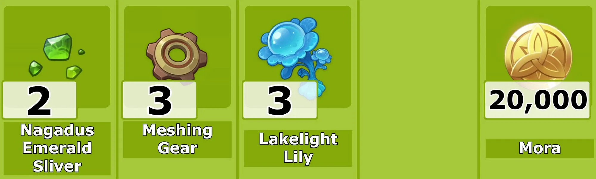 | 20 | 1x Изумрудная Щепка Нагадуса | 3x зацепляющегося механизма | - | 3x Лейклайт Лили | 20 000 |