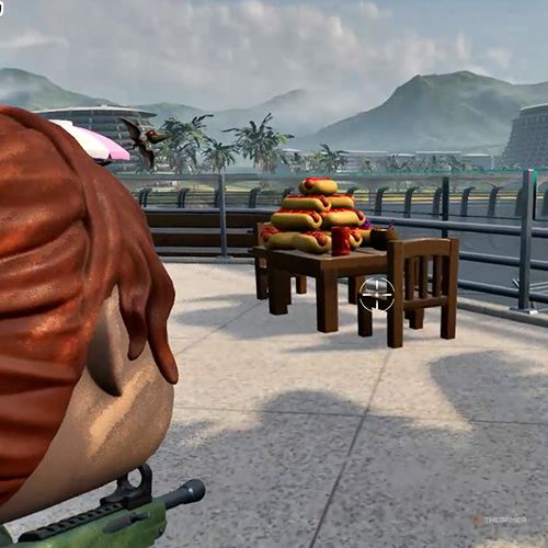 ![]() | После выполнения первой главной цели главы — победы над пятью дилофозаврами — вы получите ключ для входа в здание Юрского инновационного центра. Используйте винтовую лестницу в середине здания, чтобы добраться до верхнего этажа, затем запрыгните на зеленый стул слева от деревянного сундука. Вы увидите платформу впереди, на которую нельзя подняться по лестнице, но вы можете выстрелить в кучу хот-догов, которую там видите. |