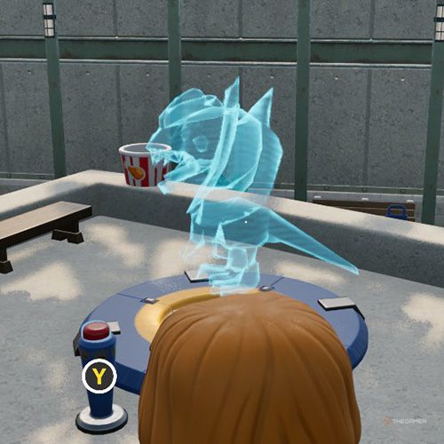 ![]() | После настройки первой голограммы развернитесь и направляйтесь к зеленой машине на открытой местности. Войдите в проход к справа от зеленой машины. Сломайте замок на здании слева от стойки с хот-догами и поднимитесь по лестнице. Поднявшись по лестнице, поверните налево, и вы увидите вторую голограмму динозавра. Эту голограмму нужно изменить на большого динозавра, похожего на тираннозавра. |