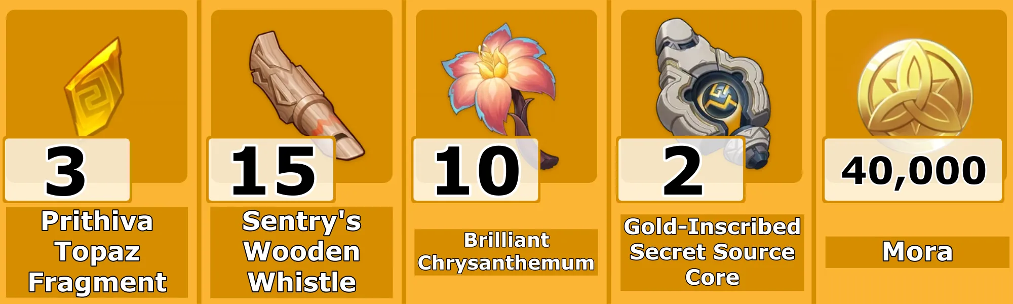 | 40 | 3x Фрагмент топаза Притхива | 15x Деревянный свисток дозорного | 2x Ядро таинственного источника с золотой надписью | 10x Сверкающая хризантема | 40,000 |