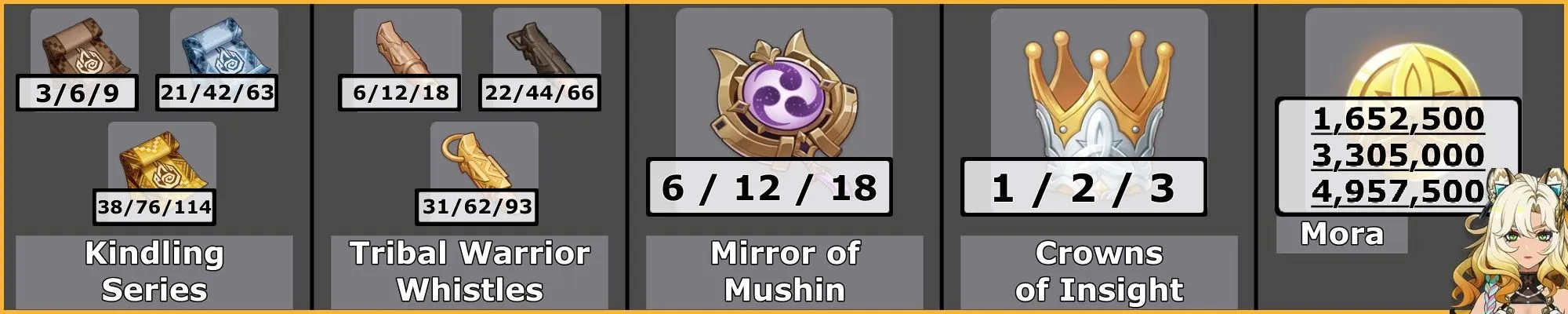 Неизвестно почему, но Шилонен странным образом использует материал trounch из битвы с боссом Скарамушом. Независимо от этого, ей понадобится горстка Зеркал Мусин для улучшения своих талантов, а также несколько других предметов, описанных здесь.