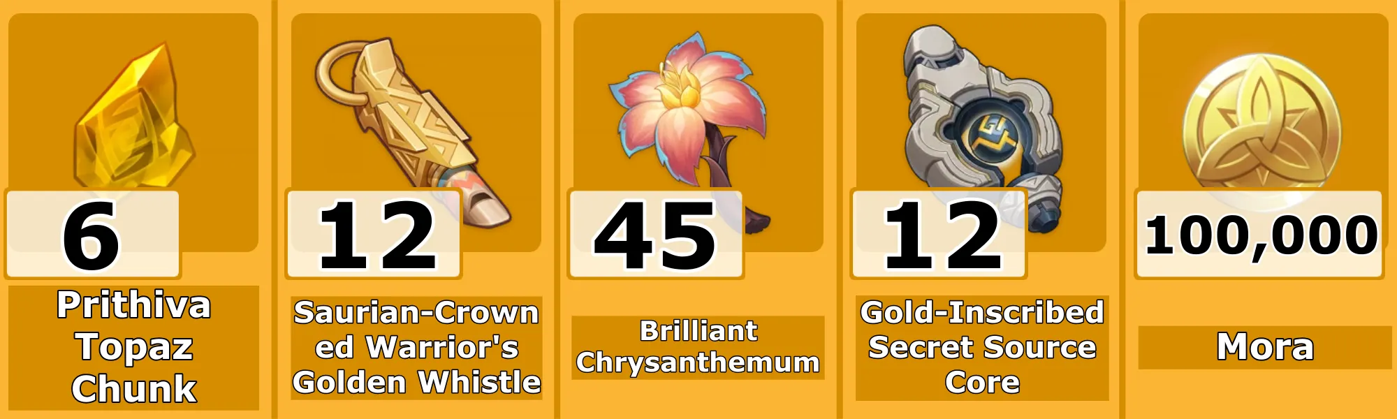 | 50 | 6x Фрагмент топаза Притхива | 12x Металлический свисток воина | 4x Ядро таинственного источника с золотой надписью | 20x Сверкающая хризантема | 60,000 |