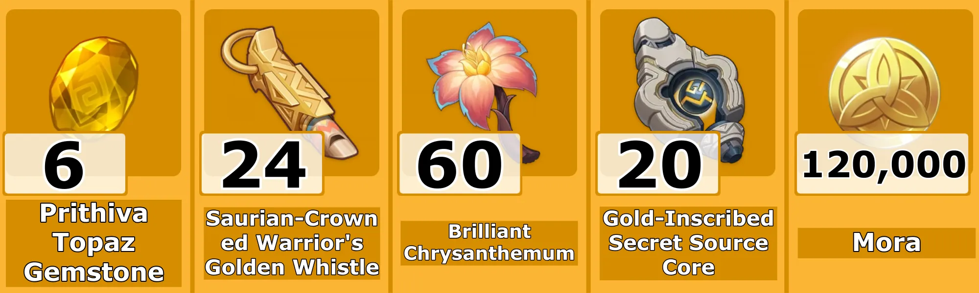 | 80 | 6x Драгоценный топаз Притхива | 24x Золотой свисток коронованного заврианами воина | 20x Ядро таинственного источника с золотой надписью | 60x Сверкающая хризантема | 120,000 |