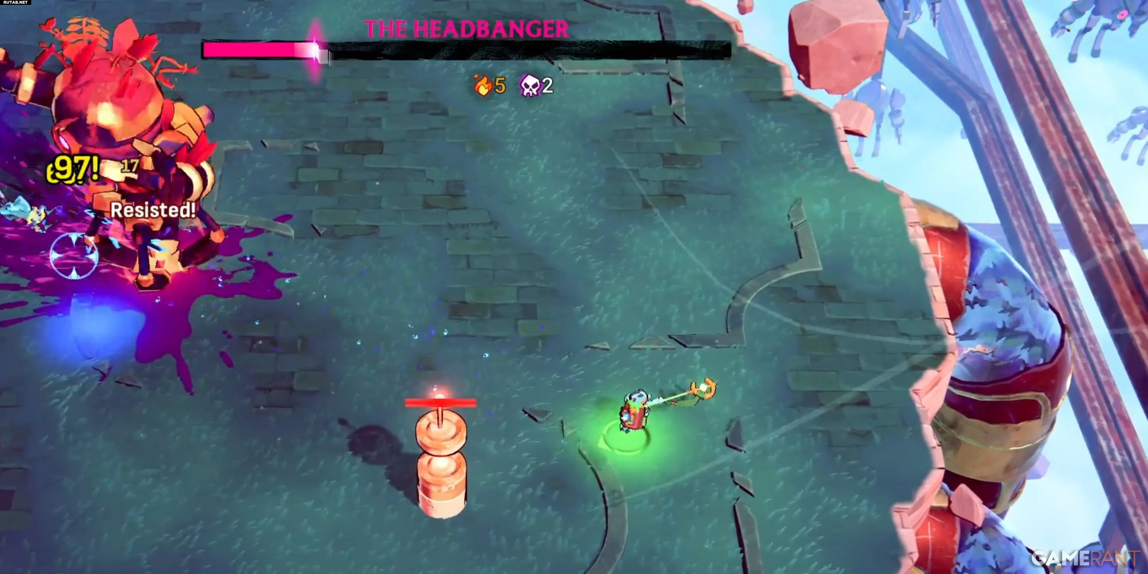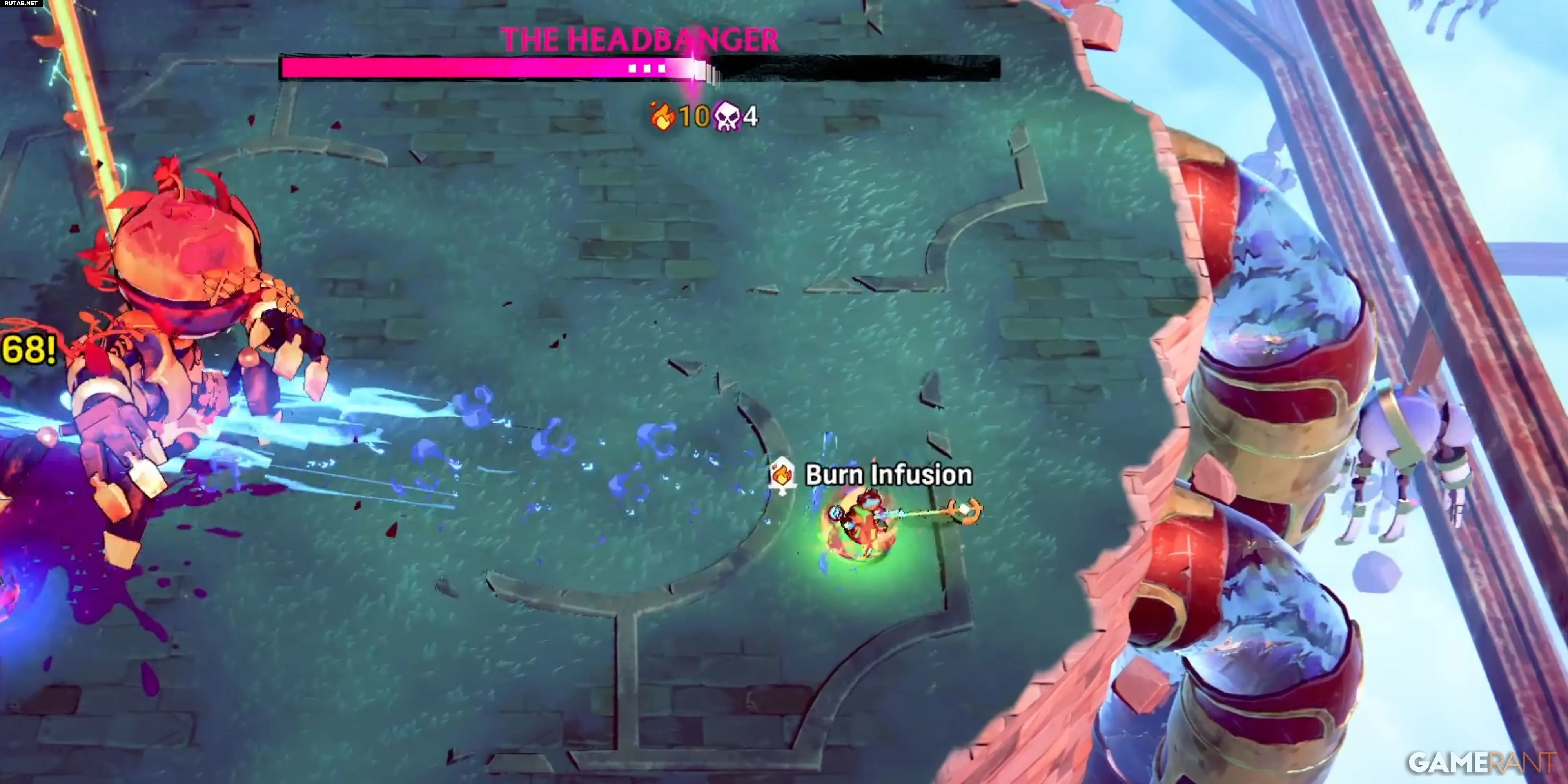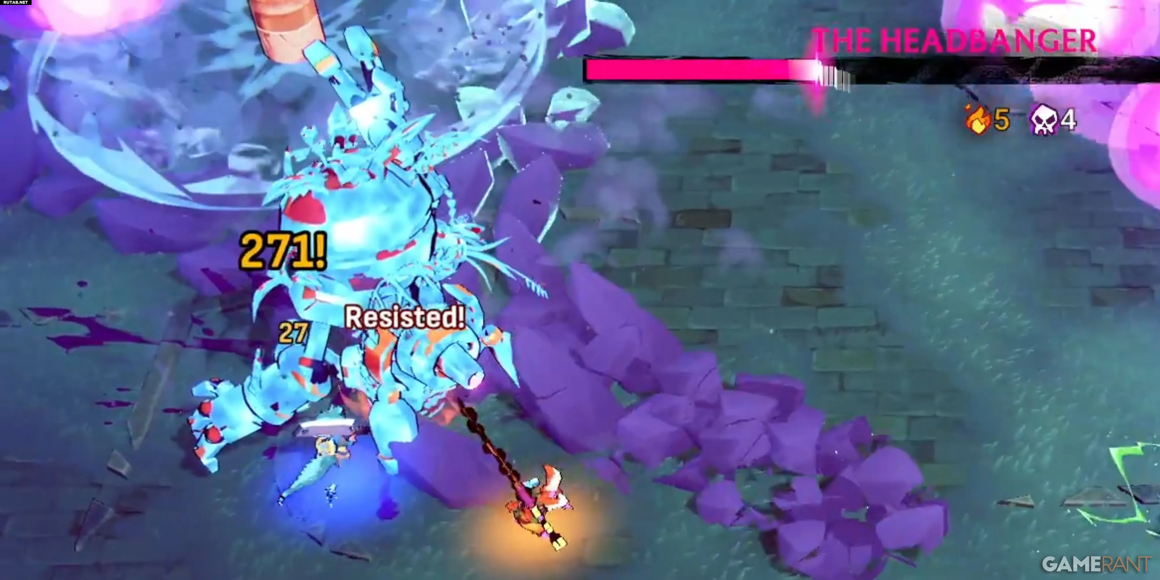 Как только игроки подойдут достаточно близко, экран на секунду потемнеет, прежде чем они вступят в схватку с The Headbanger. Большая полоса здоровья, появляющаяся на экране, является знаковой чертой битв с боссами, которая дает игрокам знать, что их ждет тяжелая битва. Игроки захотят приобрести правильные улучшения для своих забегов и знать, какое снаряжение им поможет.
