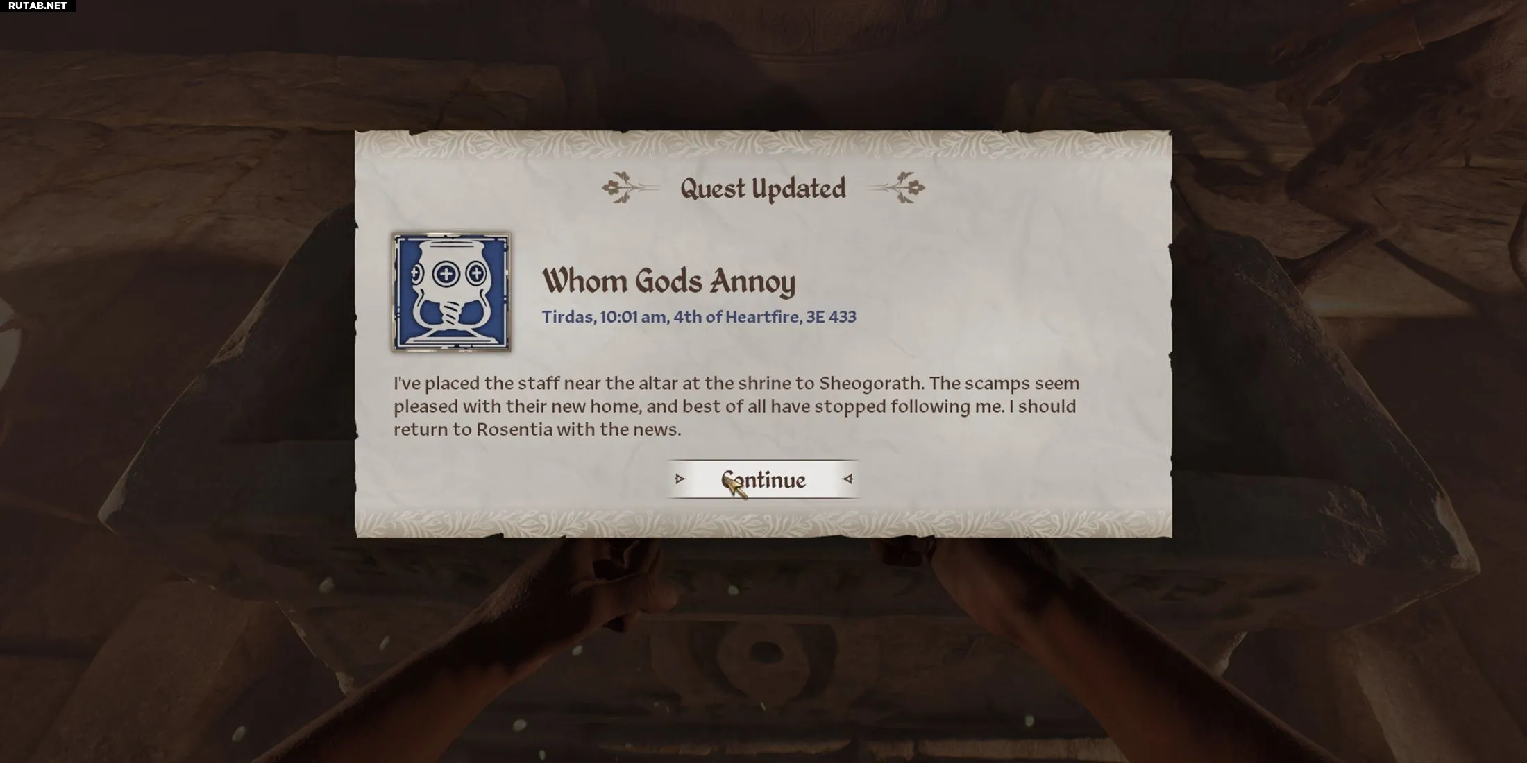 Перед статуей находится камень с меткой Обливиона. Встаньте перед камнем, откройте инвентарь и бросьте Staff of the Everscamp. Теперь игрок свободен от проклятия. Итак, выйдите из пещеры и встретьтесь с Розентией в ее доме. Поговорите с Розентией, чтобы получить Кольцо Грани Эйдолона в качестве награды за квест.