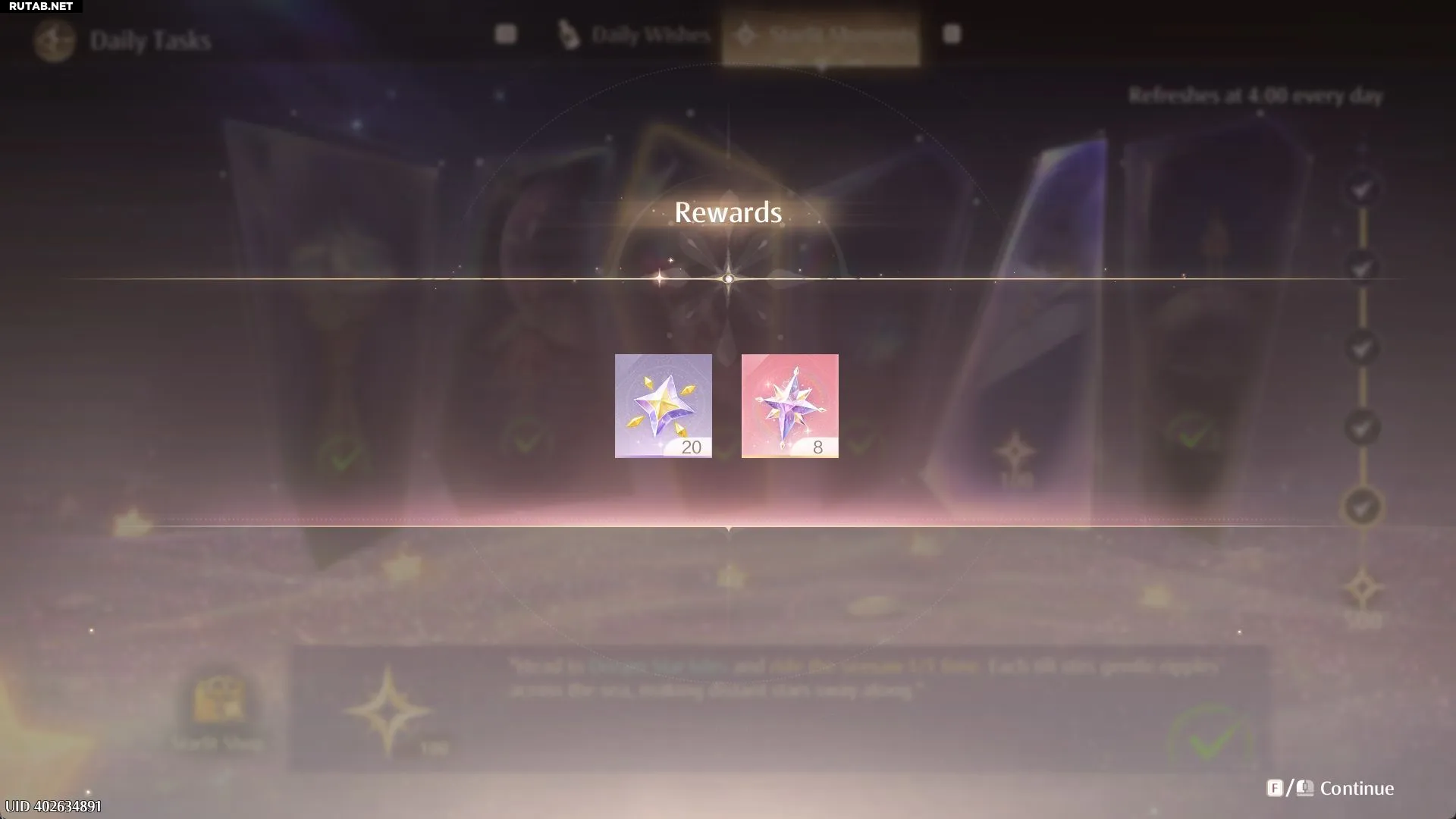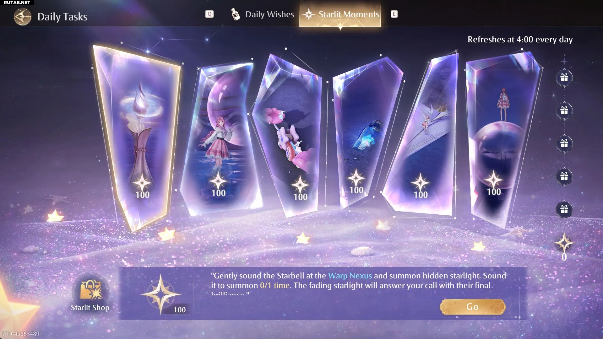 В разделе «Ежедневные задания» появилась новая вкладка — «Момент Звездного Света». Выполняя задания (например, звонок в «Звездный Колокол» или прохождение локаций), вы получаете очки. Набрав 500 очков, можно забрать награды: 20 Starlit Crystals и 8 Эфирных Звезд ежедневно.