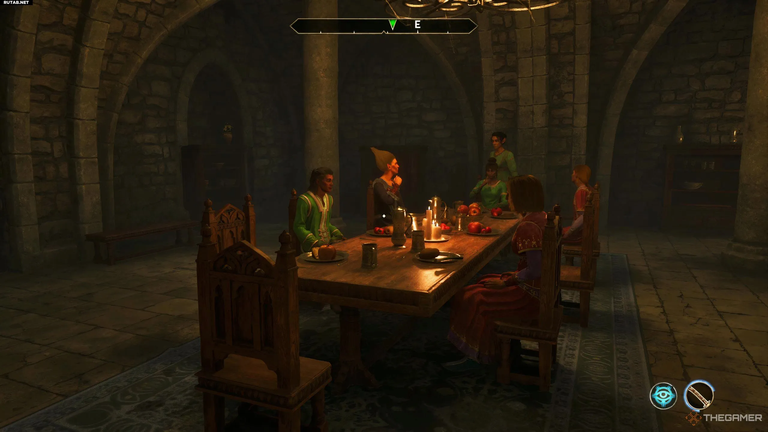 Войдя в зал, примените заклинание «Суровая реальность» в центре стола. Все гости (и вы) потеряют одежду и снаряжение. После этого: