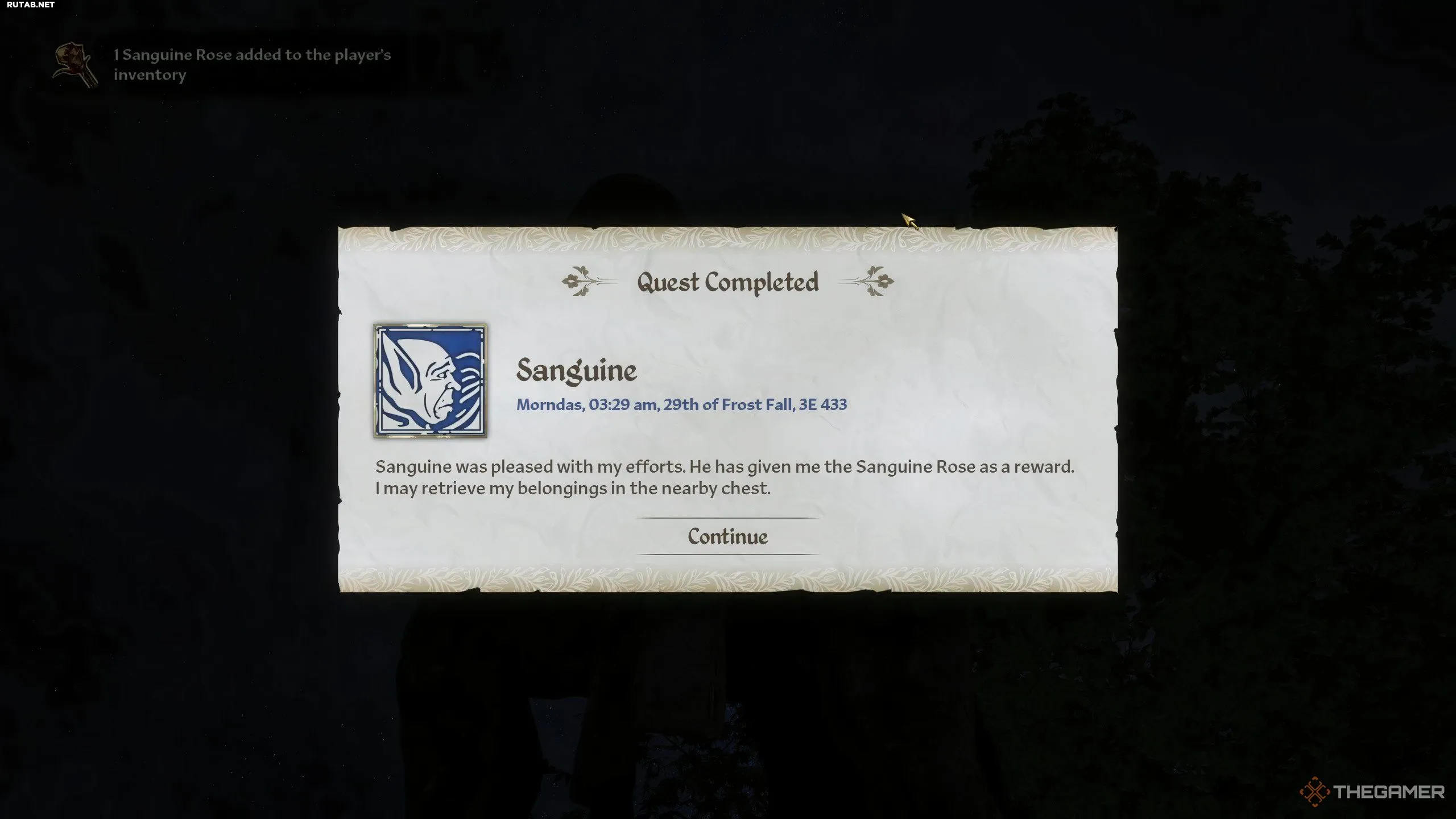 Сангвин вернёт ваше снаряжение и даст «Кровавую Розу» — посох, призывающий даэдра для атаки врагов. Но будьте осторожны: если даэдра убьёт цель, он нападёт на вас!