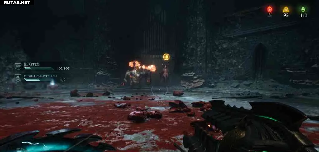Продолжайте спускаться вниз, и вы столкнетесь с Гнездом Крови. Уничтожьте его с помощью Shield Charge, чтобы вызвать несколько демонов. Автоматическая награда за победу над мини-боссом Кибердемоном в этой схватке.