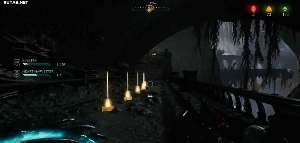 Продвигайтесь по разрушенному кораблю, пока не пройдете через комнату, полную взрывоопасных бочек и имп-сталкеров. Поднявшись по пандусу, над вами будет оранжевая цепь, которую вы можете сломать, чтобы сбросить ящик. Этот ящик поднимет ворота напротив вас, позволяя вам ступить на трамплин. Это поднимет вас туда, где вы можете взять 5 Золота и Рубин.