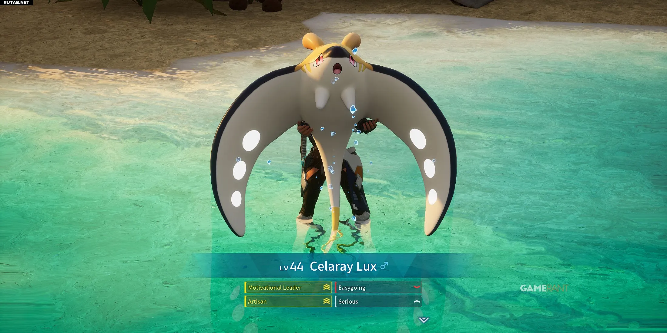 Теперь перейдём к старым палам, которые получили новые варианты. Следующий — Пенгуллет Lux, пал типа Вода/Электричество. В настоящее время Пенгуллета Lux можно поймать только с помощью рыбалки ночью в Пустынных дюнах и на Острове гниющих сокровищ.