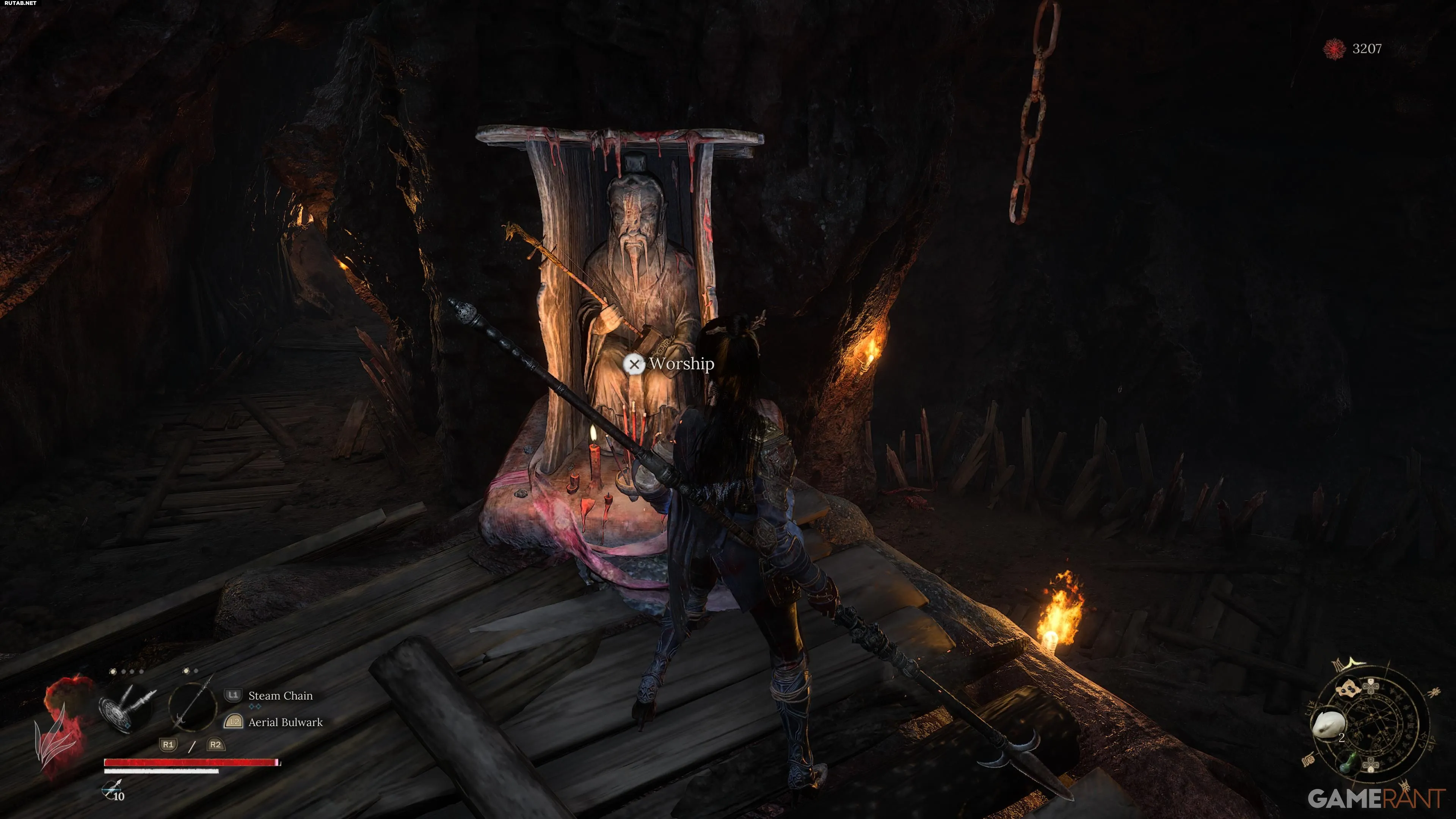 Это последний алтарь перед первым боссом, поэтому убедитесь, что ваше снаряжение готово, а уровень достаточно высок. От алтаря поднимитесь по лестнице, игнорируя двух врагов во дворе. Продолжайте движение к зданию впереди, где вы найдёте ворота. Их открытие запустит битву с боссом – Мастером-рейдером – Дутангой-людоедом.