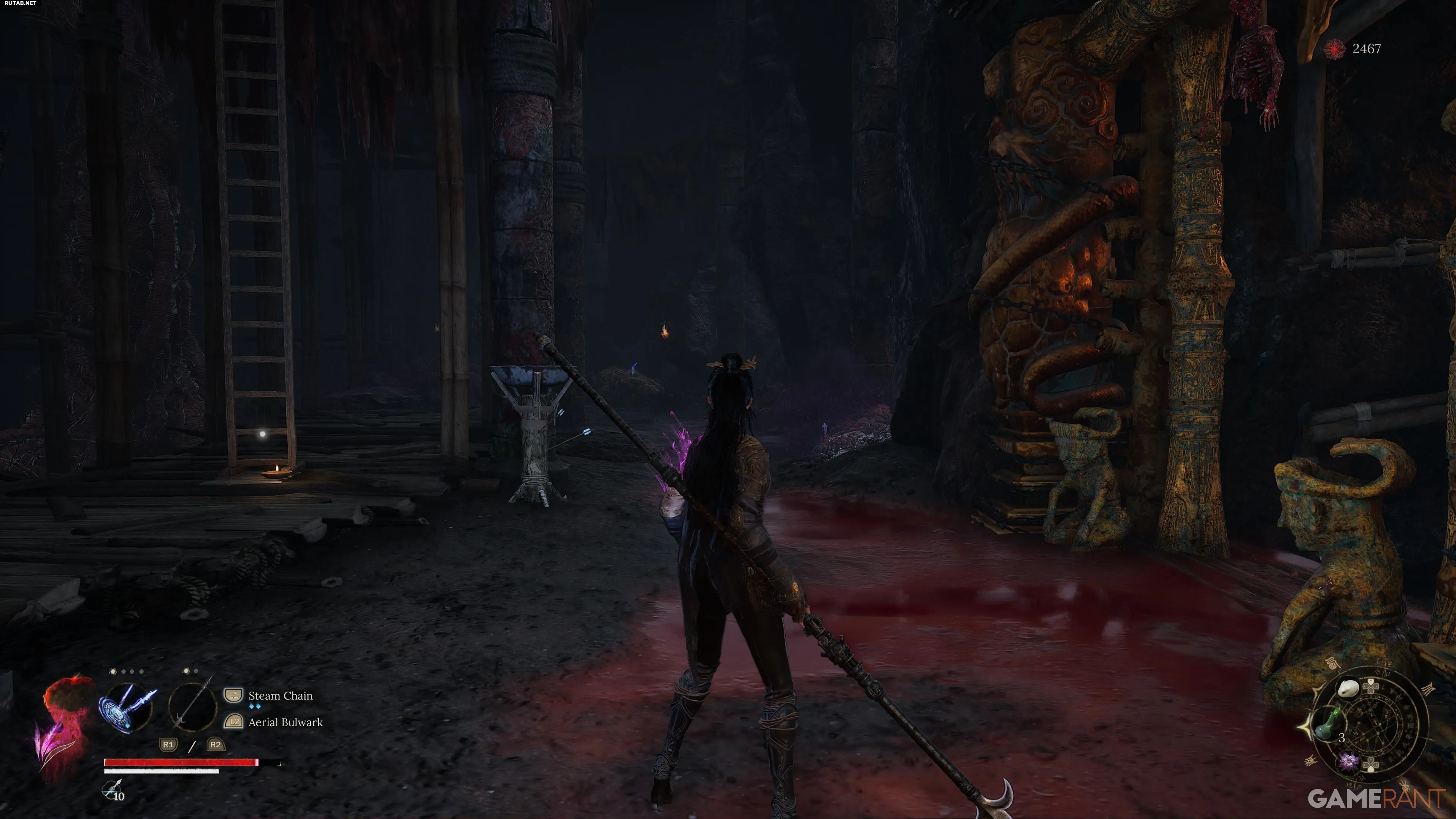 От алтаря в «Святилище Шу» взаимодействуйте с механизмом перед вами, используя ключ святилища. Это откроет путь в подземелье — «Ртутную мастерскую». Спуститесь, пройдите через зону «Осквернения» и найдите алтарь справа. Далее двигайтесь по покрытой плотью тропе рядом с алтарём, выбрав маршрут, где вас обстреливают два стрелка. Спуститесь по деревянным доскам, поверните направо, затем налево, чтобы найти лестницу вверх.