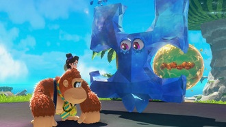 Выше вы найдёте ещё один кран с бетонным кубом. Разрушьте его с помощью Kong Bananza, чтобы добыть камень.