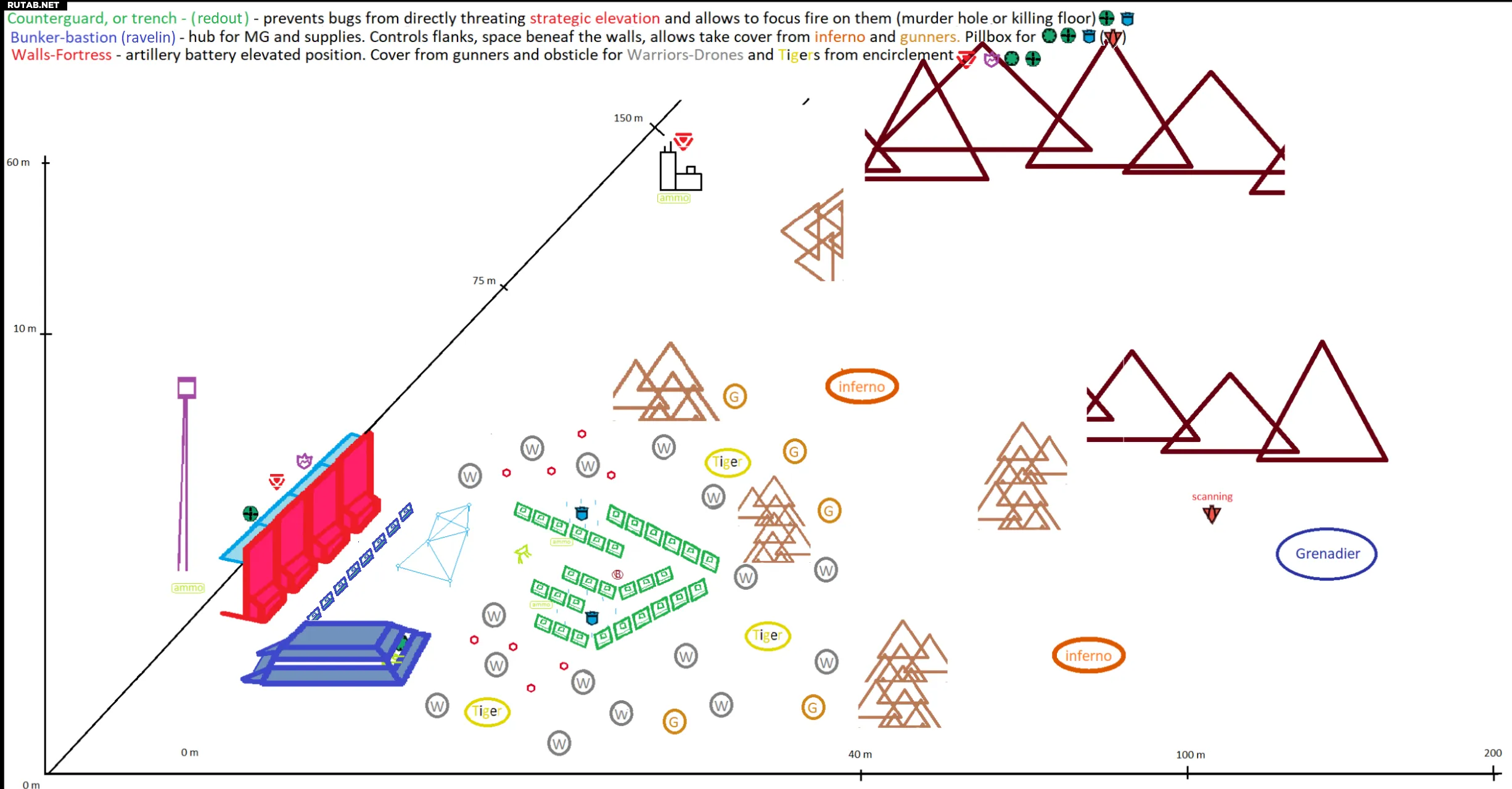 - Синий равелин — ПБП, закрывающий мёртвую зону у стен и контролирующий фланги базовой обороны.