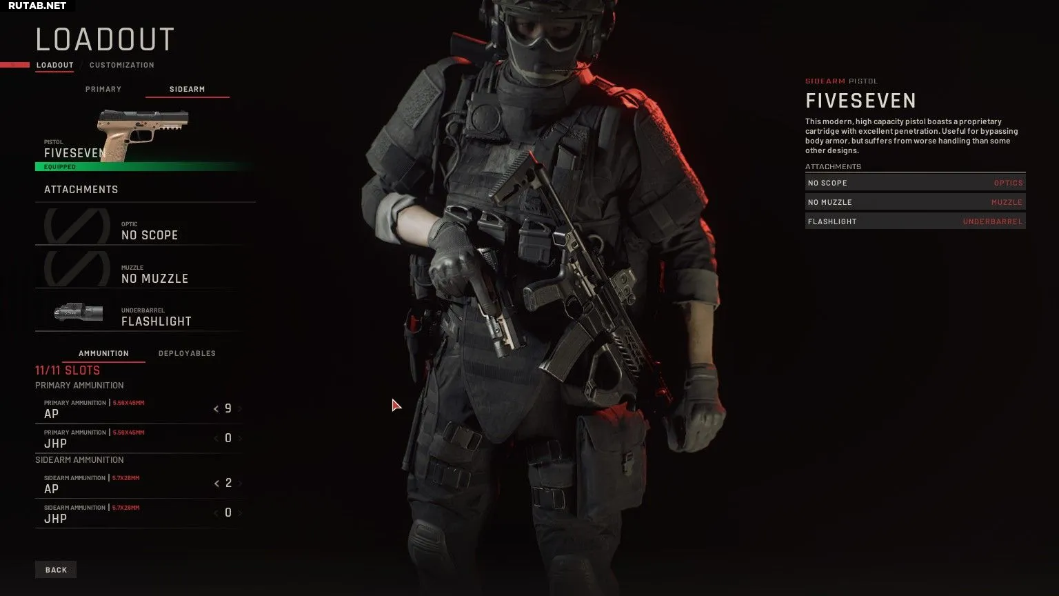 | Второстепенное оружие | Five-Seven с фонарём и опциональным коллиматором |