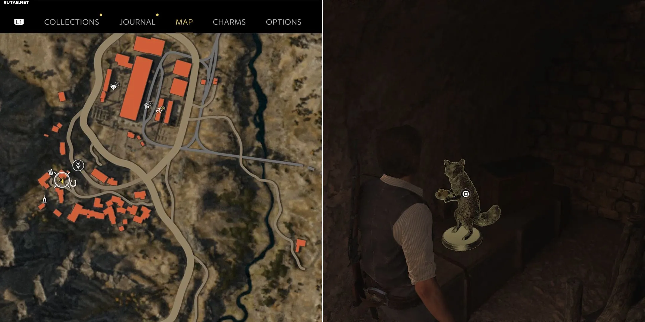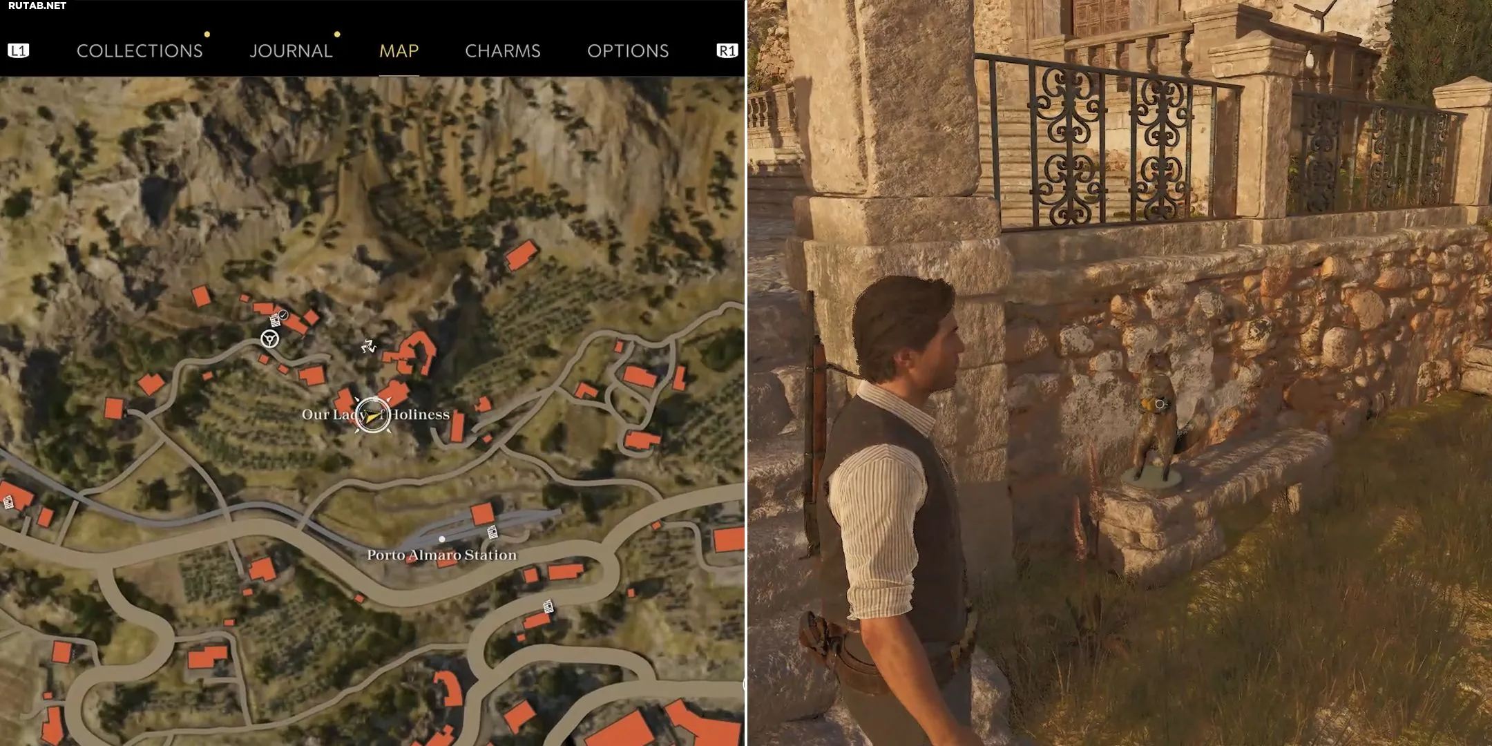 Продолжайте движение на юго-запад ближе к лесопилке Базиле или к западу от магазина Паскуале. Поднимитесь по склону и взберитесь на холм, чтобы добраться до спрятанной статуэтки.