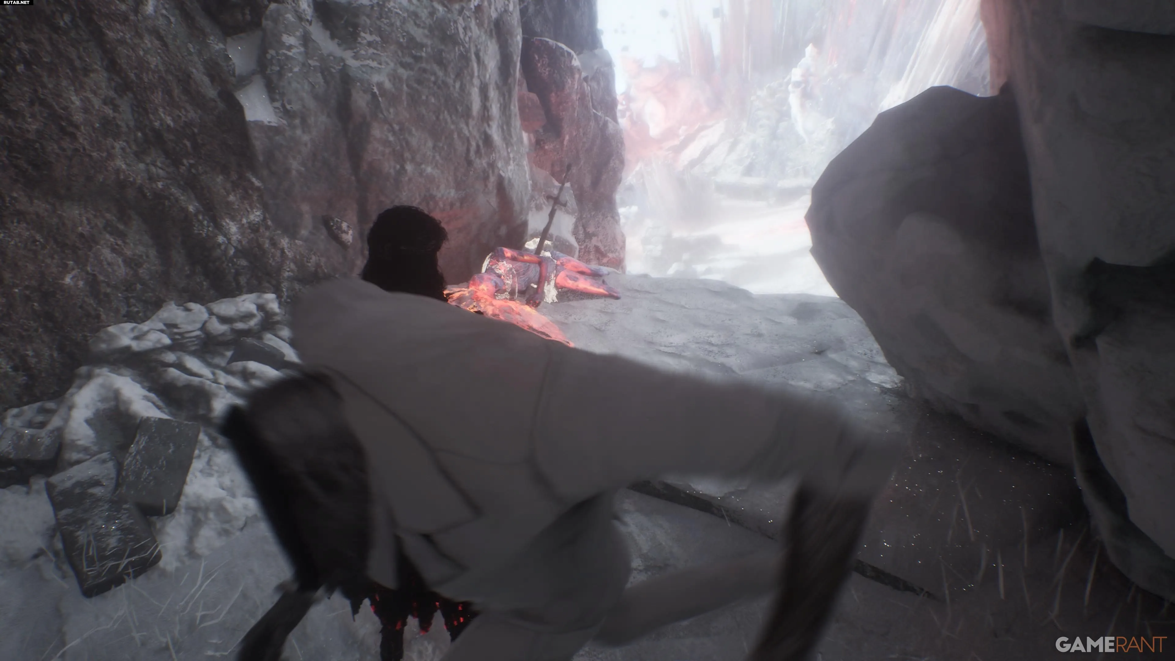 От флага идите по правой тропе, ведущей к двум огненным противникам. В конце пути вас ждёт третий материал для улучшения в Замерзших Сердцах.