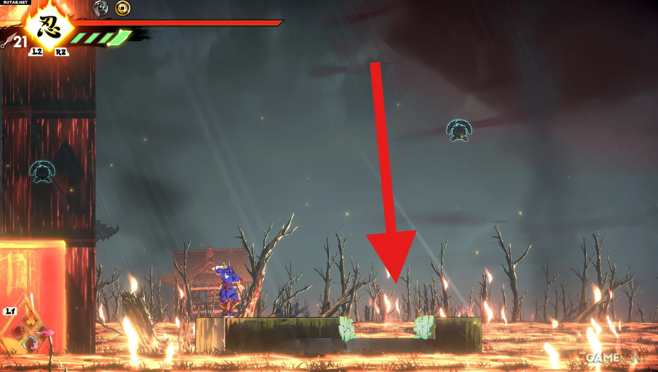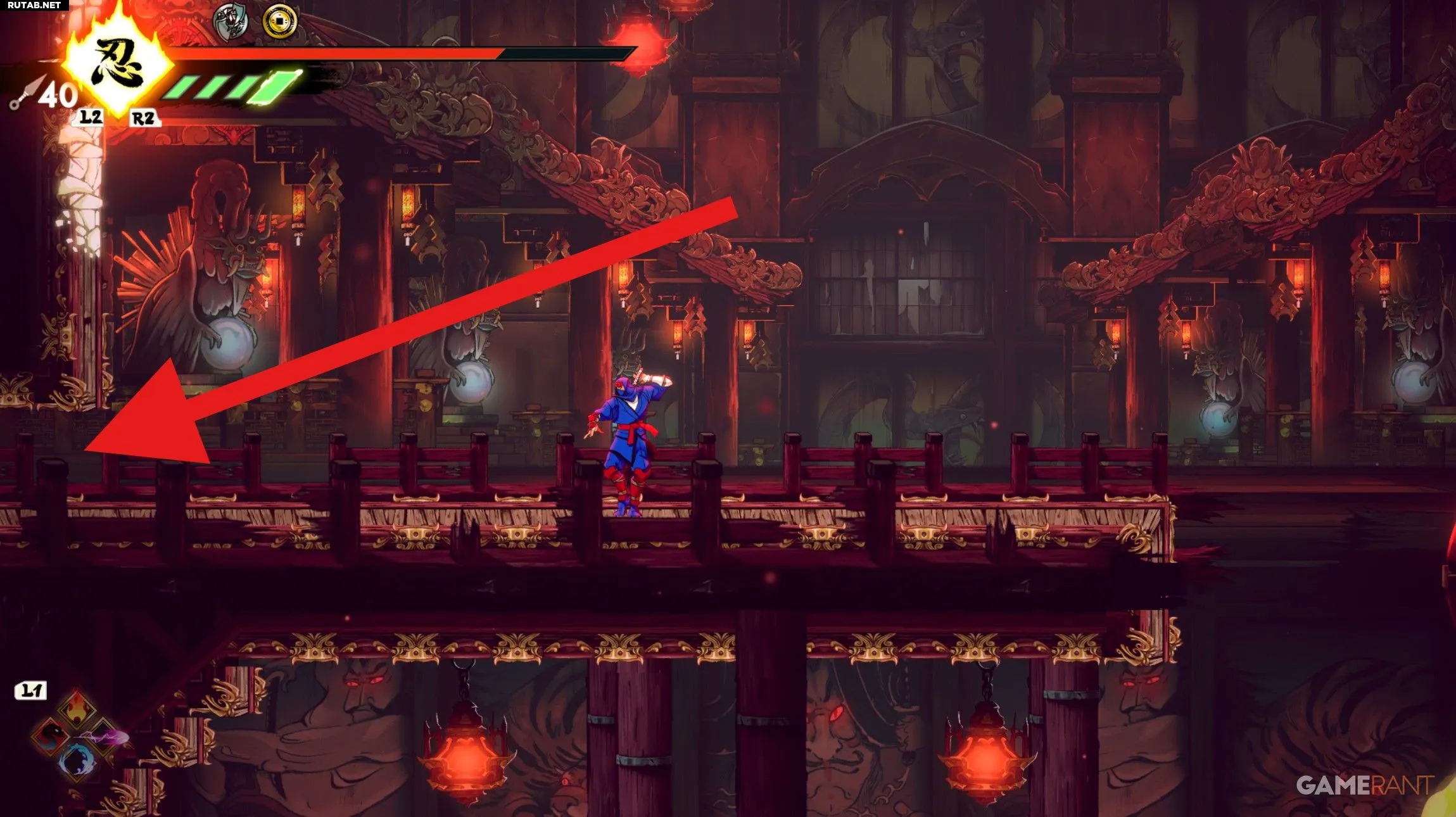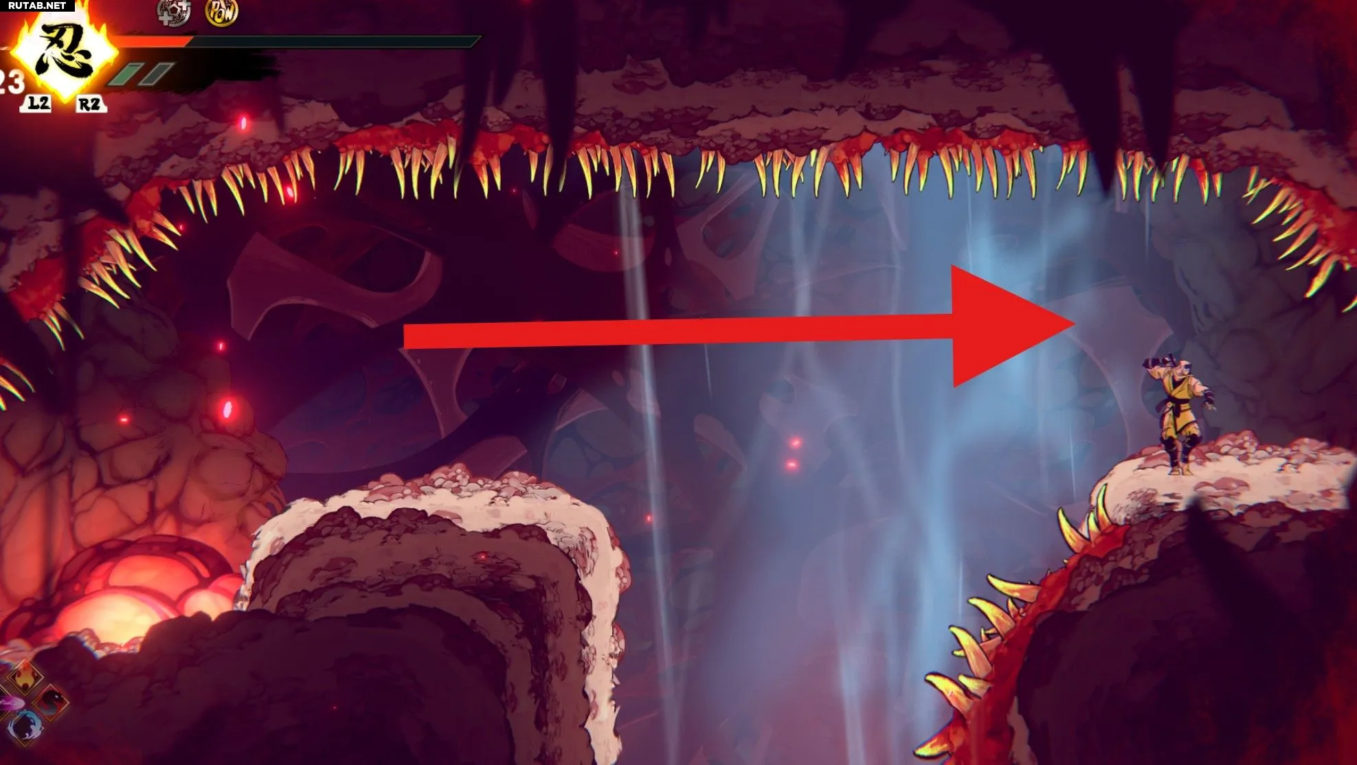 После точки сохранения Замок Руз вы достигнете вращающихся огненных препятствий. Слева перед использованием Когтей ниндзя на стене вы увидите небольшое отверстие, в которое можно пролезть (оно находится прямо под точкой сохранения Тронный зал).