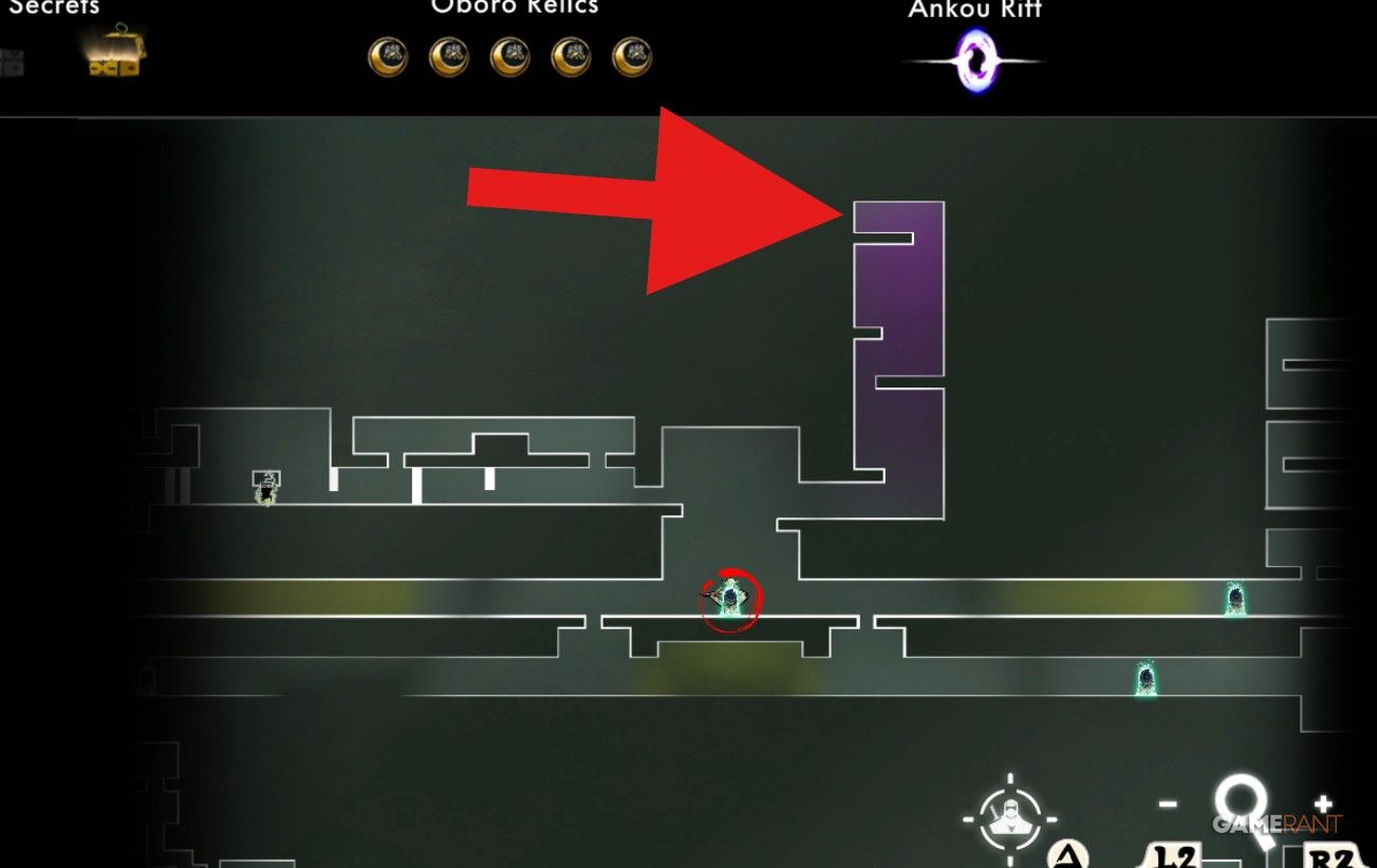 Продвигайтесь вправо, затем вверх, чтобы найти скрытую область. Идите налево, затем вверх и по кругу, сразитесь с несколькими врагами и обнаружите сундук с реликвией Оборо.
