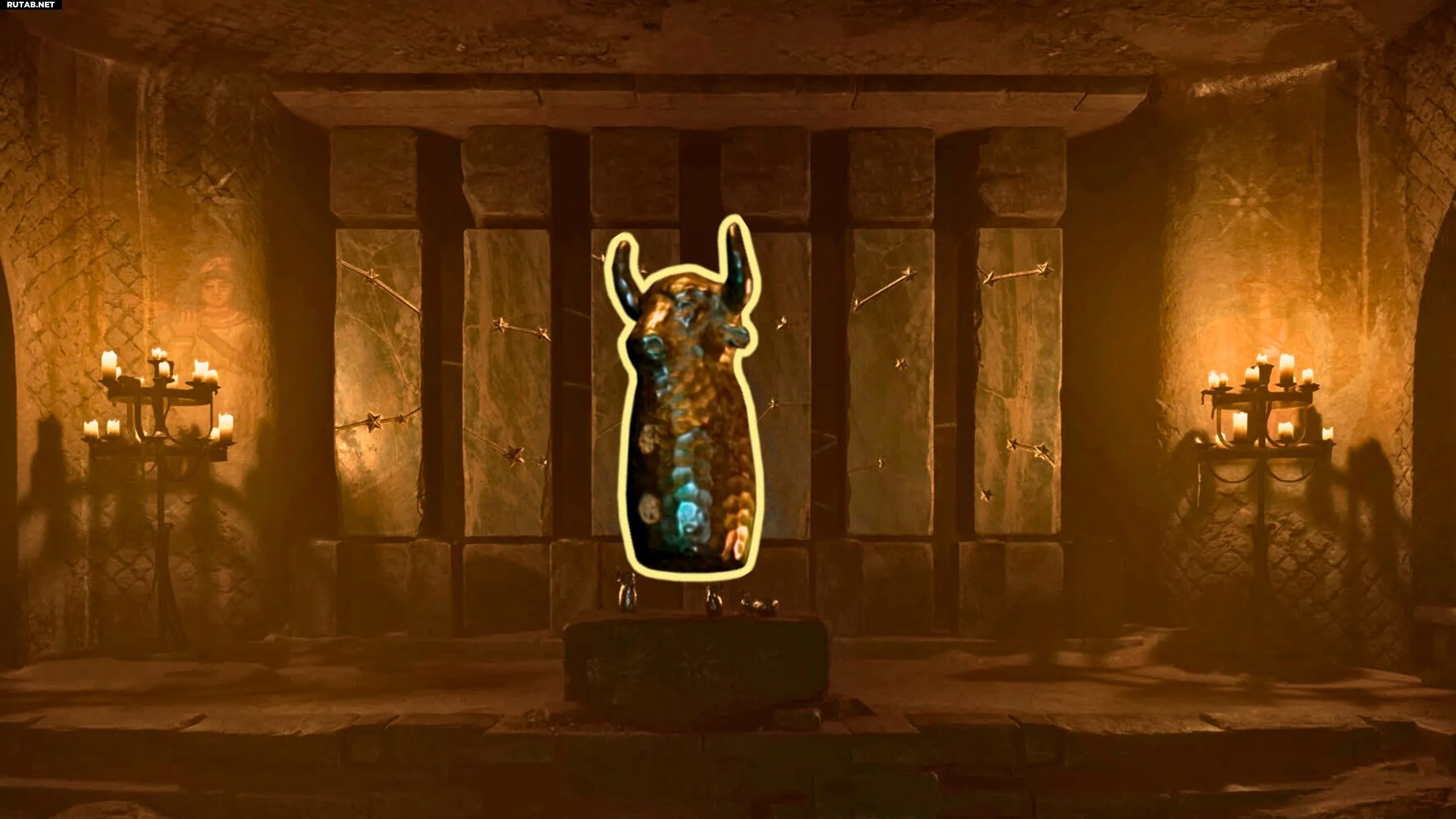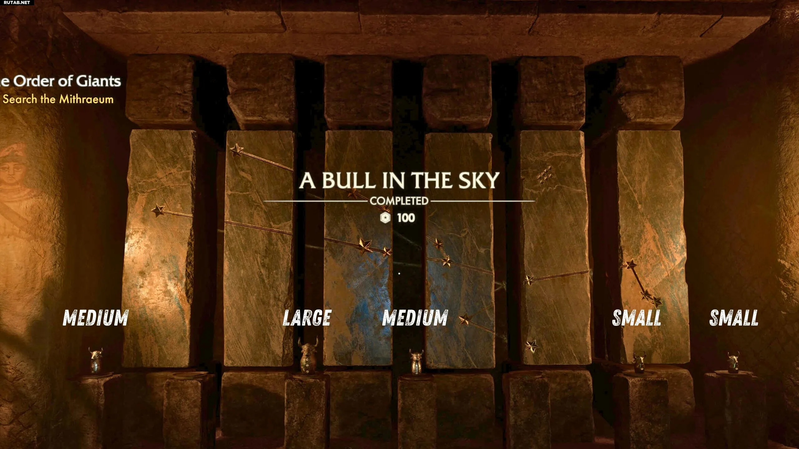 После правильного размещения гирь головоломка будет решена, и вы завершите загадку «Бык в небе». Перед уходом не забудьте забрать артефакт Нимфус со стены справа от столбов в качестве награды.