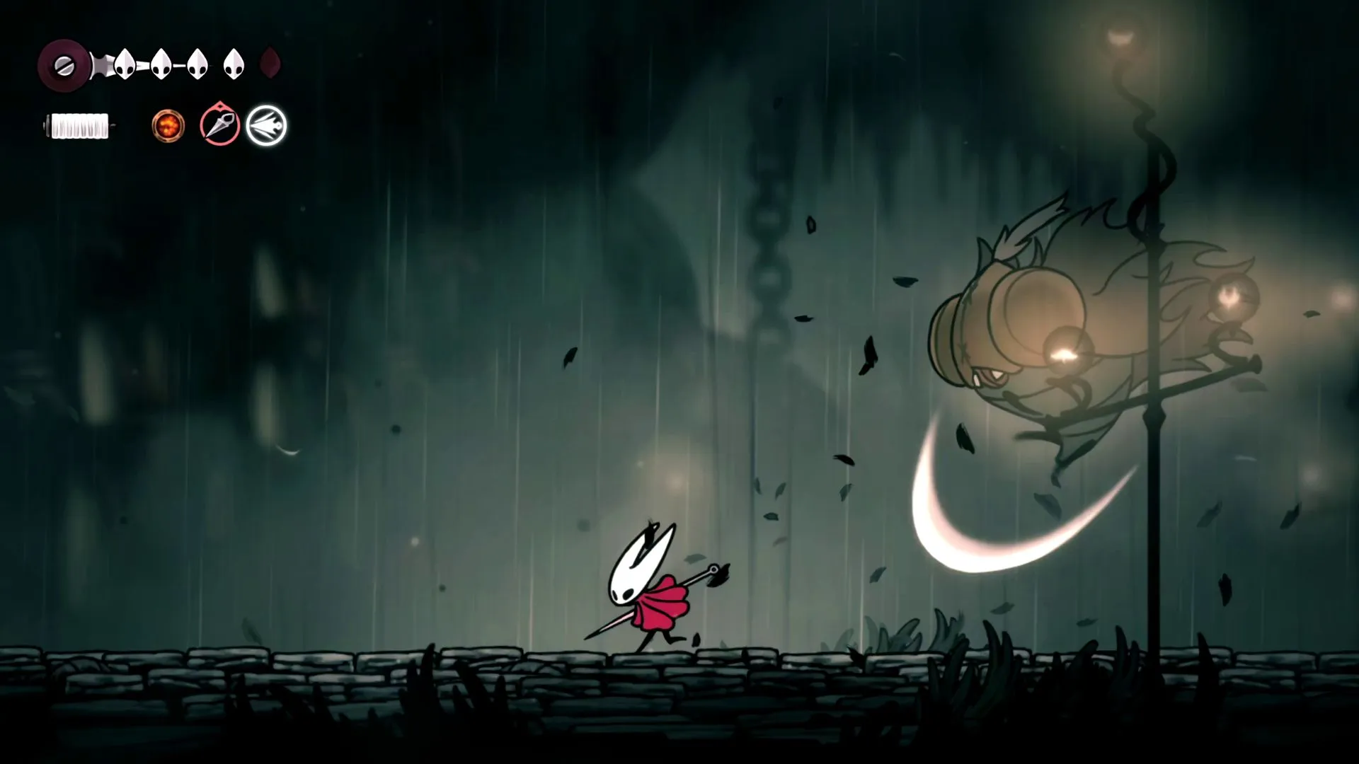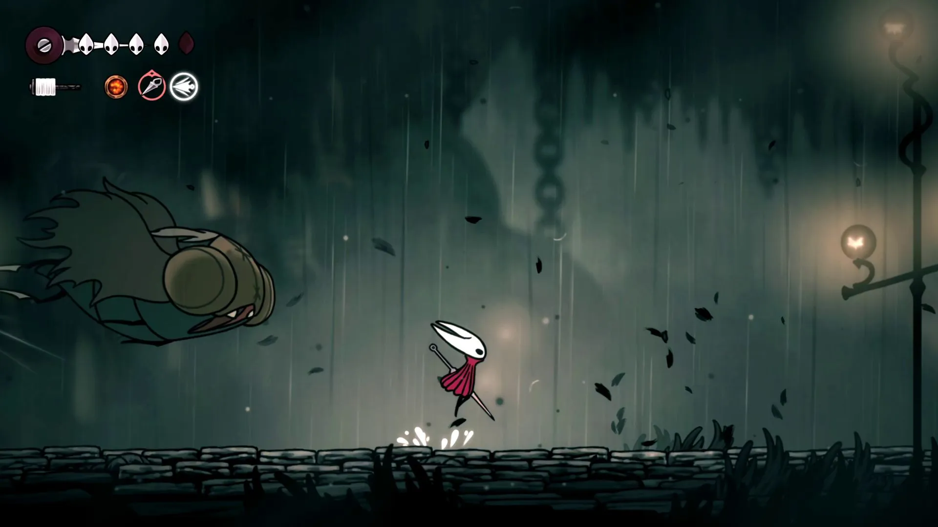 Спуститесь вниз в область с двумя врагами-паломниками, затем продолжайте движение влево до спуска под клеткой с жуком, вооружённым ножницами.