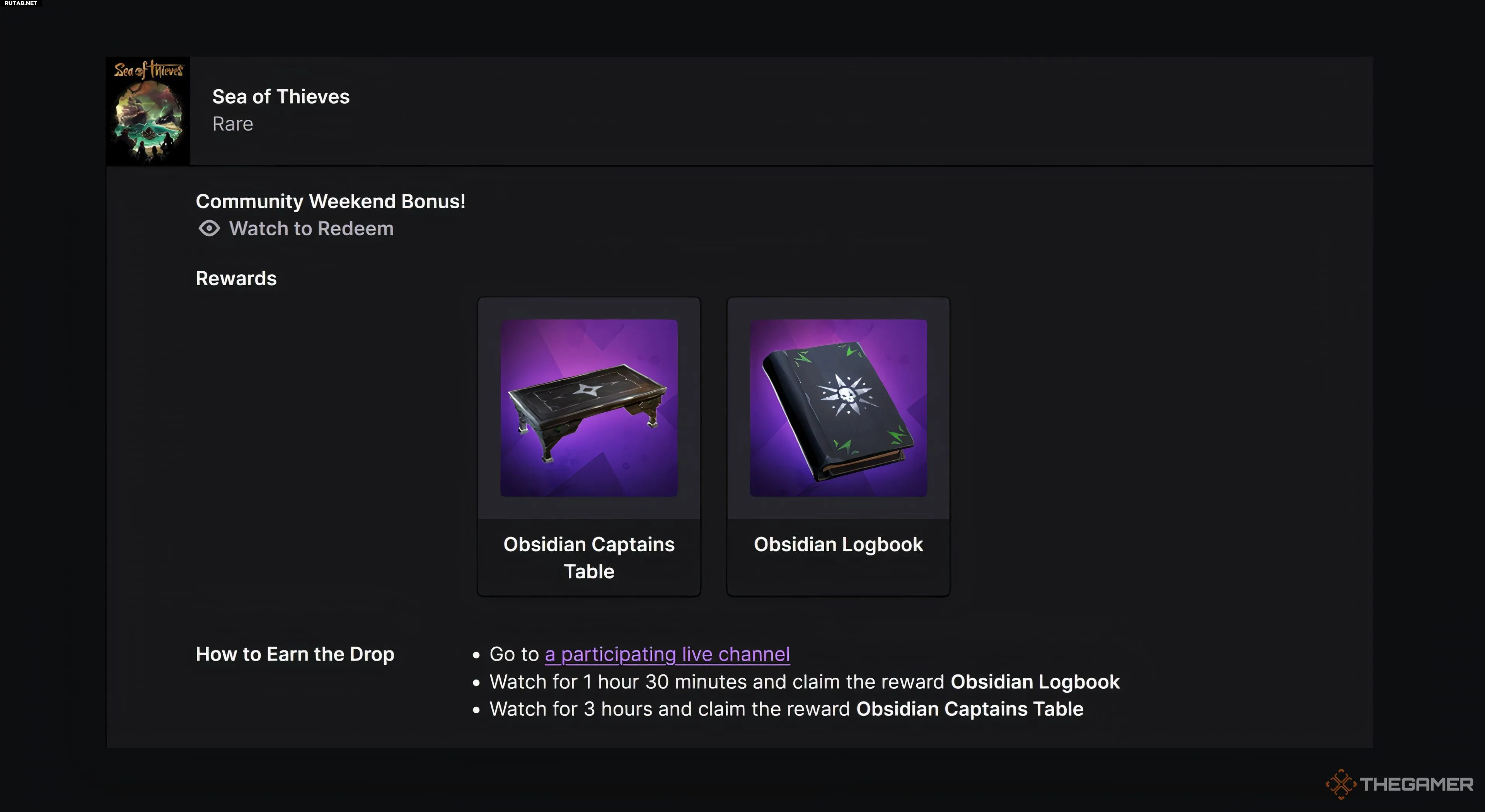 Чтобы получить Журнал капитана Обсидиана и Стол капитана, вам необходимо принять участие в кампании Twitch Drops для Sea of Thieves в период её активности. Эти бонусные дропы будут доступны с 5 по 12 сентября 2025 года до 10:00 по UTC. Чтобы заработать каждый предмет, нужно смотреть 90 минут трансляции участвующего стримера на Twitch.
