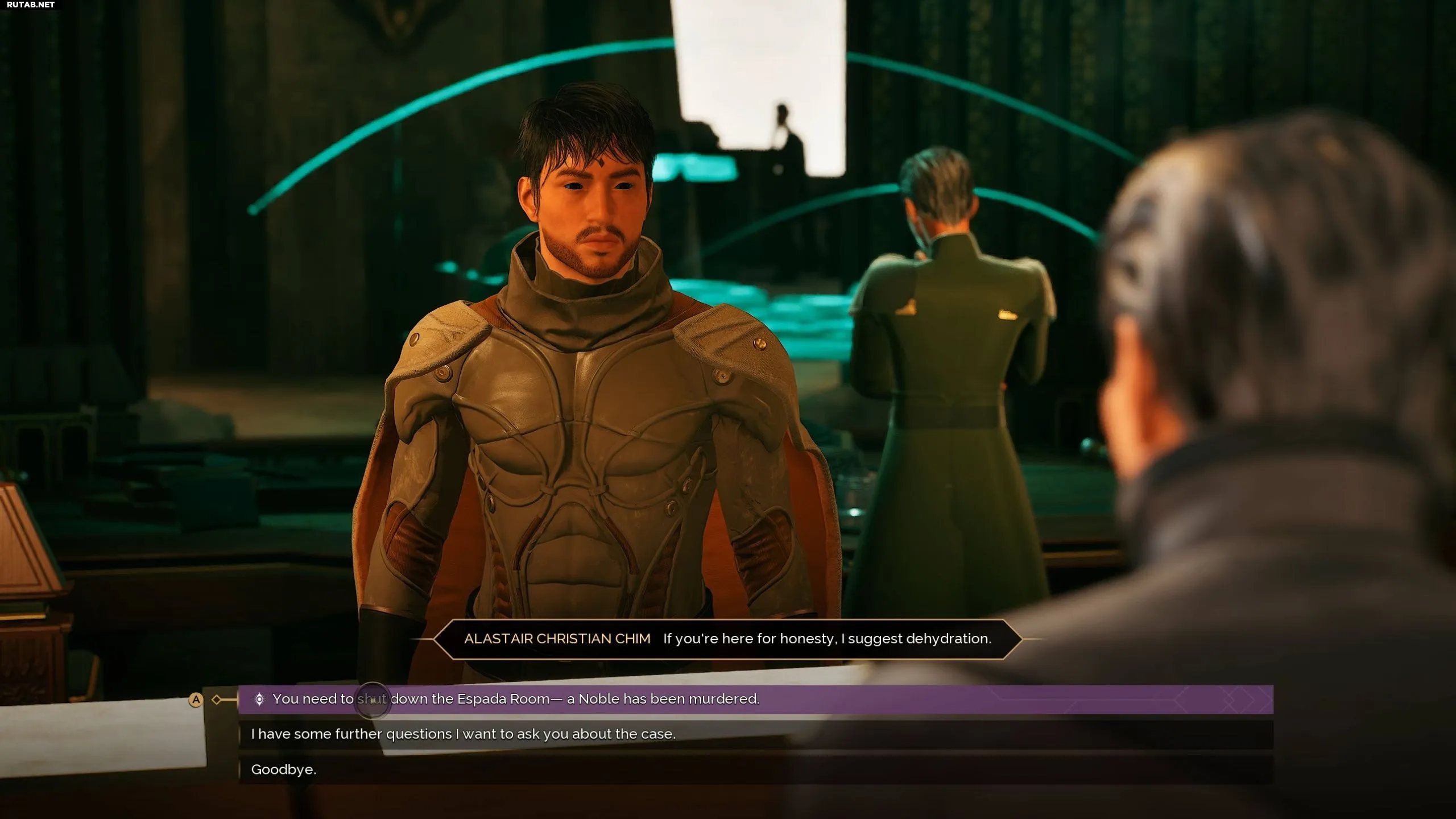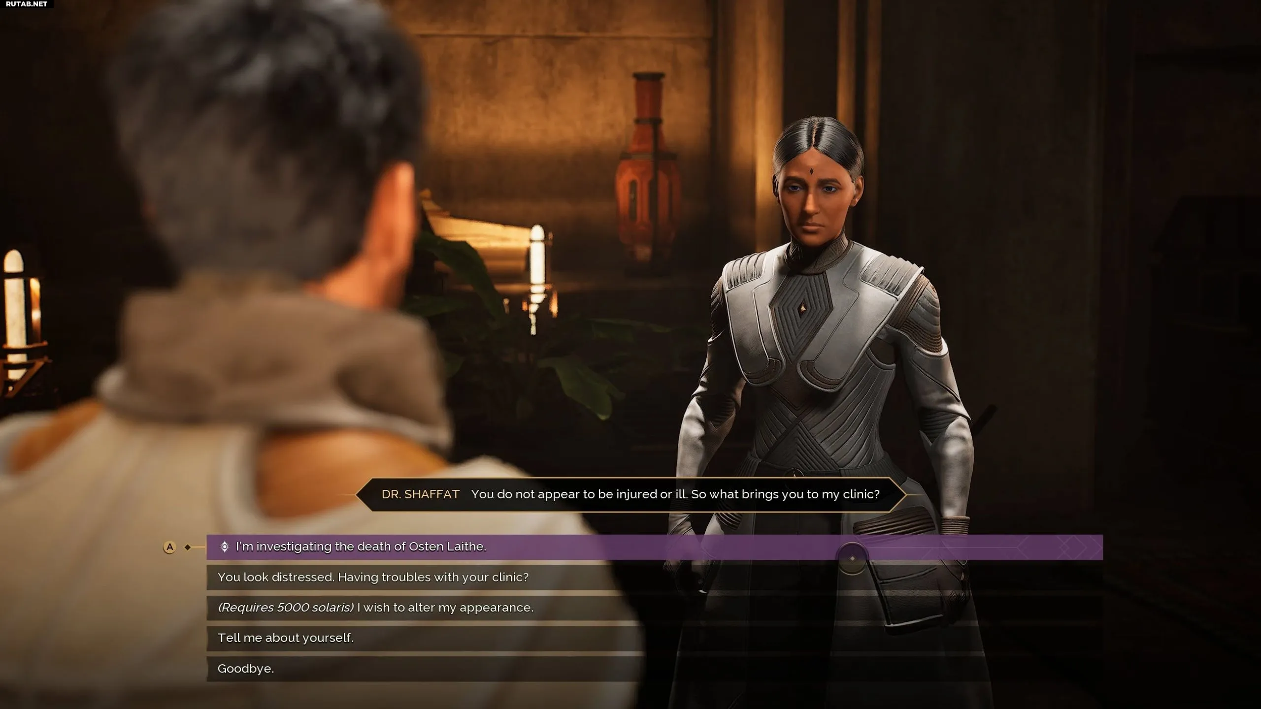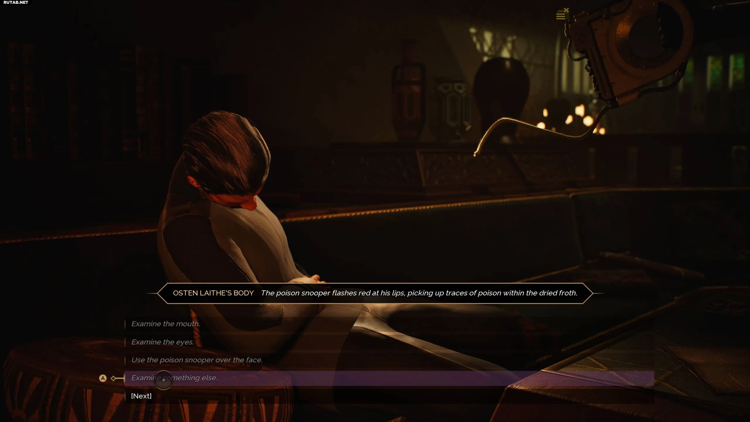 Направляйтесь ко входу в Арракин и купите инструмент за 100 соляриев у торговцев слева. Вернитесь в приватную комнату и используйте детектор яда для анализа тела Остена Лейта, особенно области рта и рук. После этого проанализируйте книгу, лежащую перед телом, с помощью детектора яда, чтобы завершить сбор доказательств криминального характера смерти.