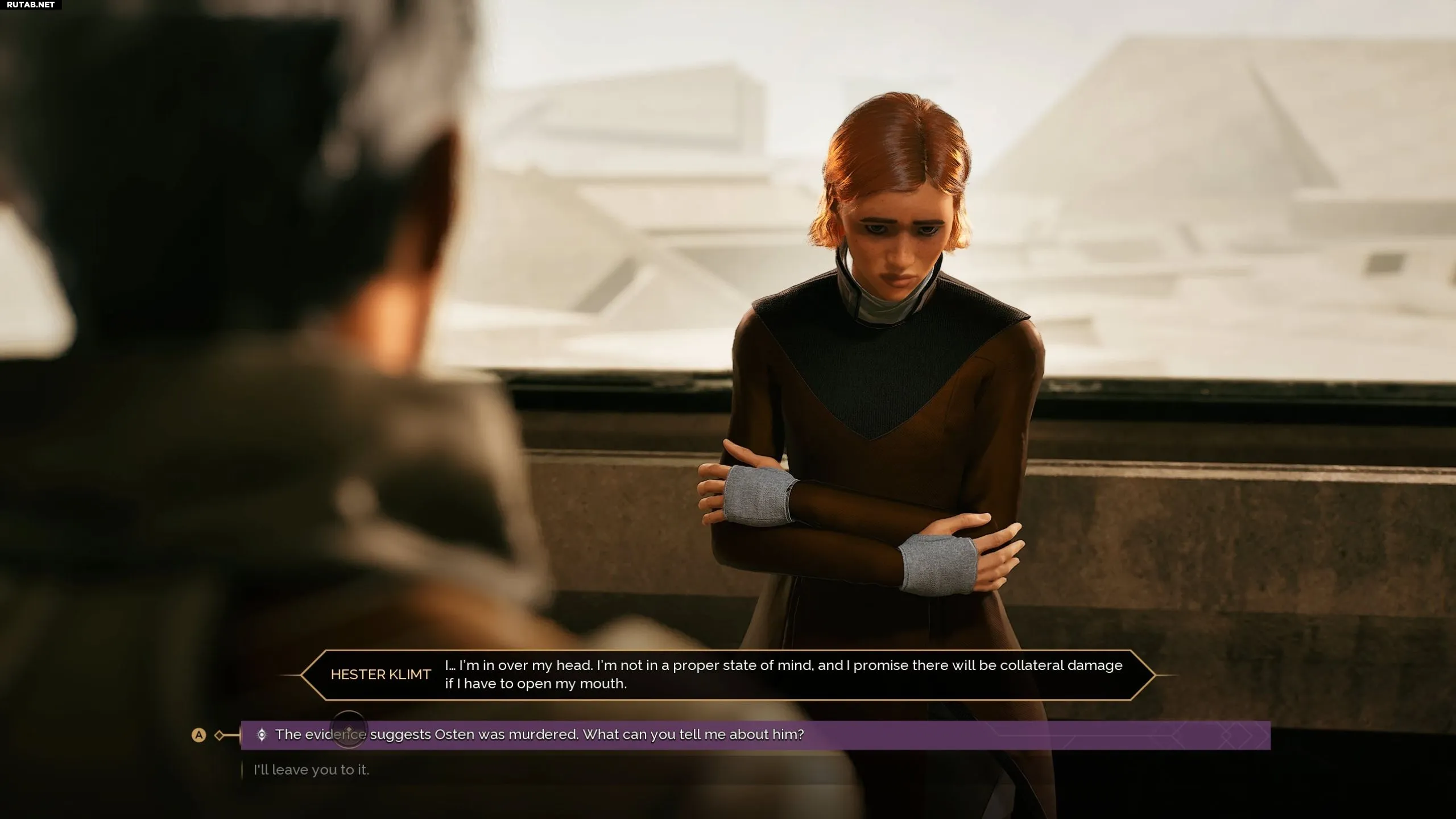 Сразу за дверью комнаты, слева, вы найдёте Хестер Климт, с которой можно поговорить о смерти Остена Лейта для дальнейшего расследования. Однако она откажется верить в нечестную игру, и вам придётся собрать медицинские доказательства для подтверждения своих подозрений.