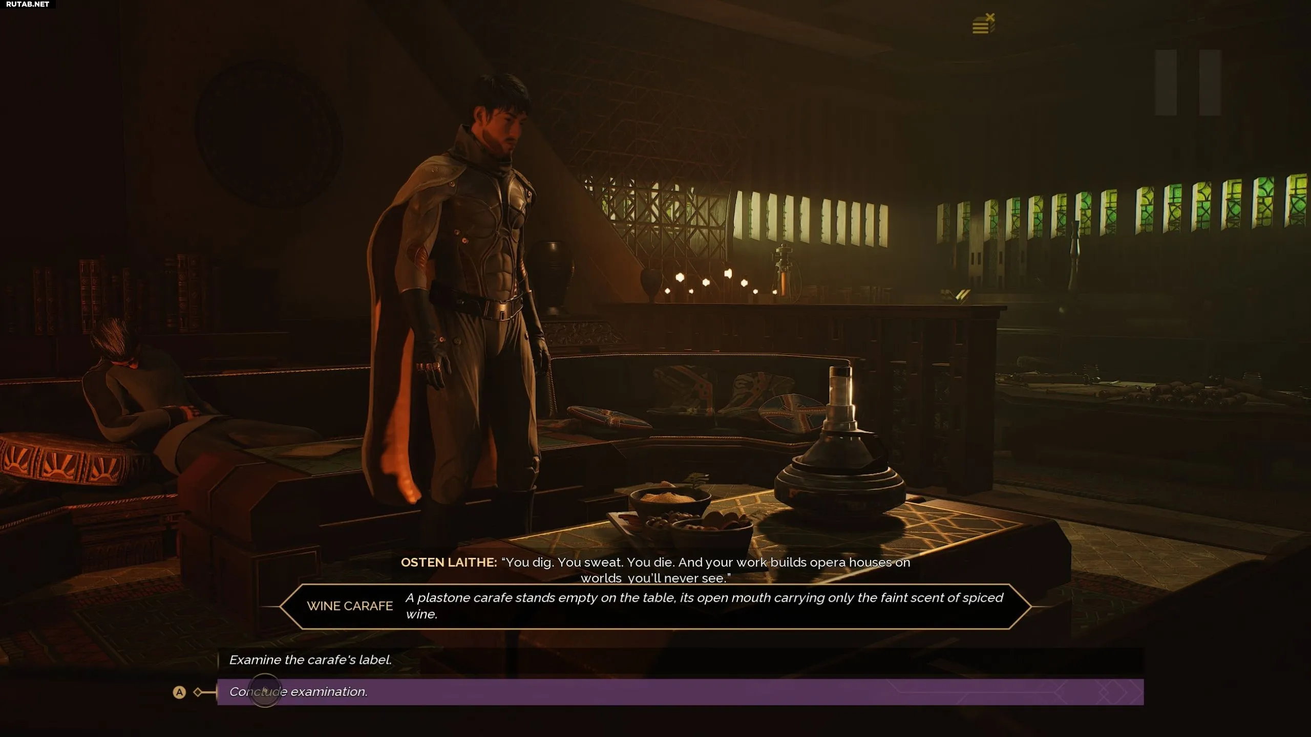 Если диалог о приватных комнатах с Уго недоступен, взаимодействуйте с пьяным офицером Атрейдесов в центре зала — он упомянет приватную комнату в ходе беседы.