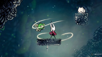 Двигайтесь направо через болото в длинную вертикальную комнату, где появляется другое кольцо. Используйте двойной прыжок, чтобы подняться, и вертикальные платформы, чтобы защитить Хорнет от атак врагов, а затем поднимитесь выше в комнату справа.