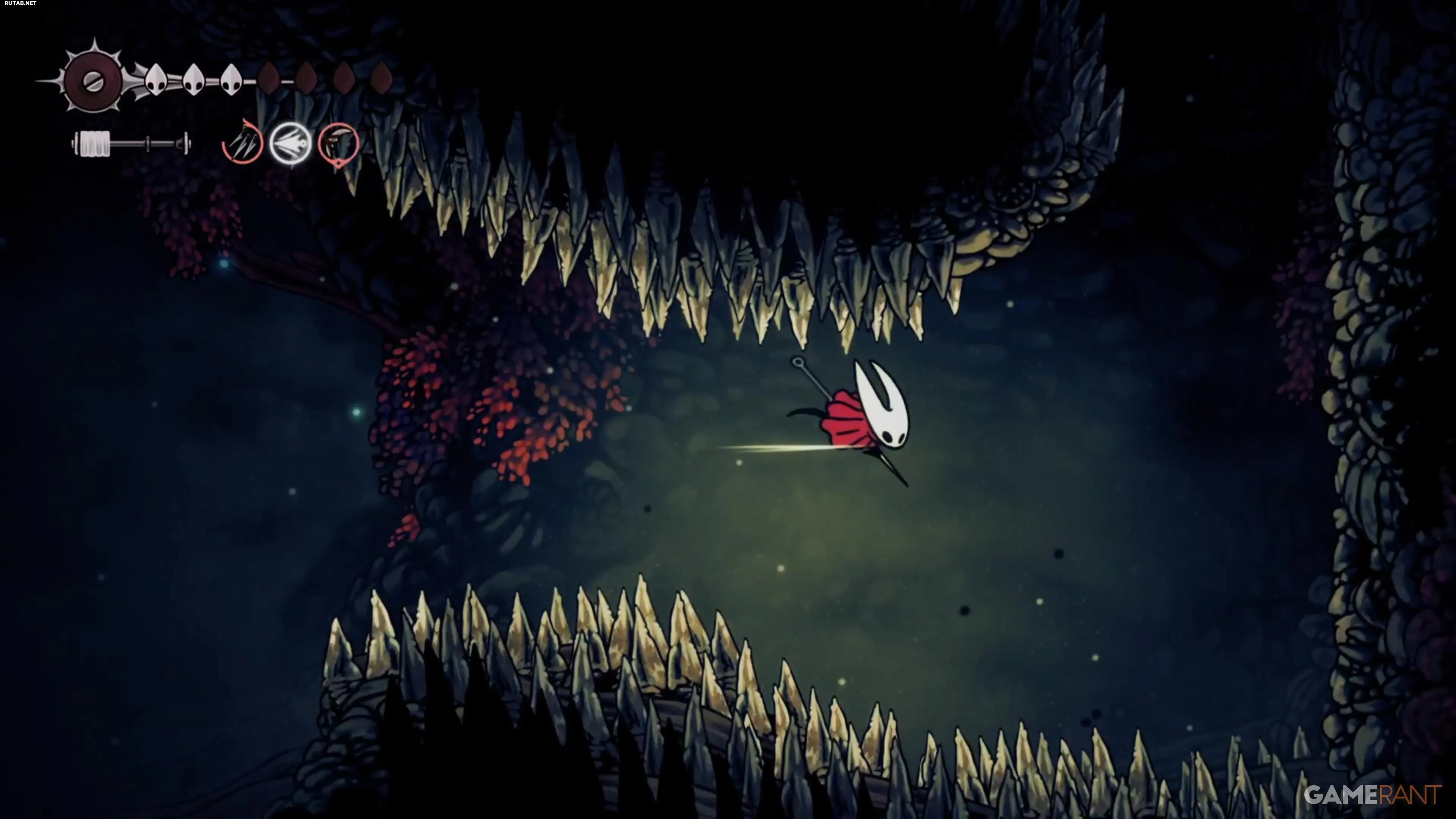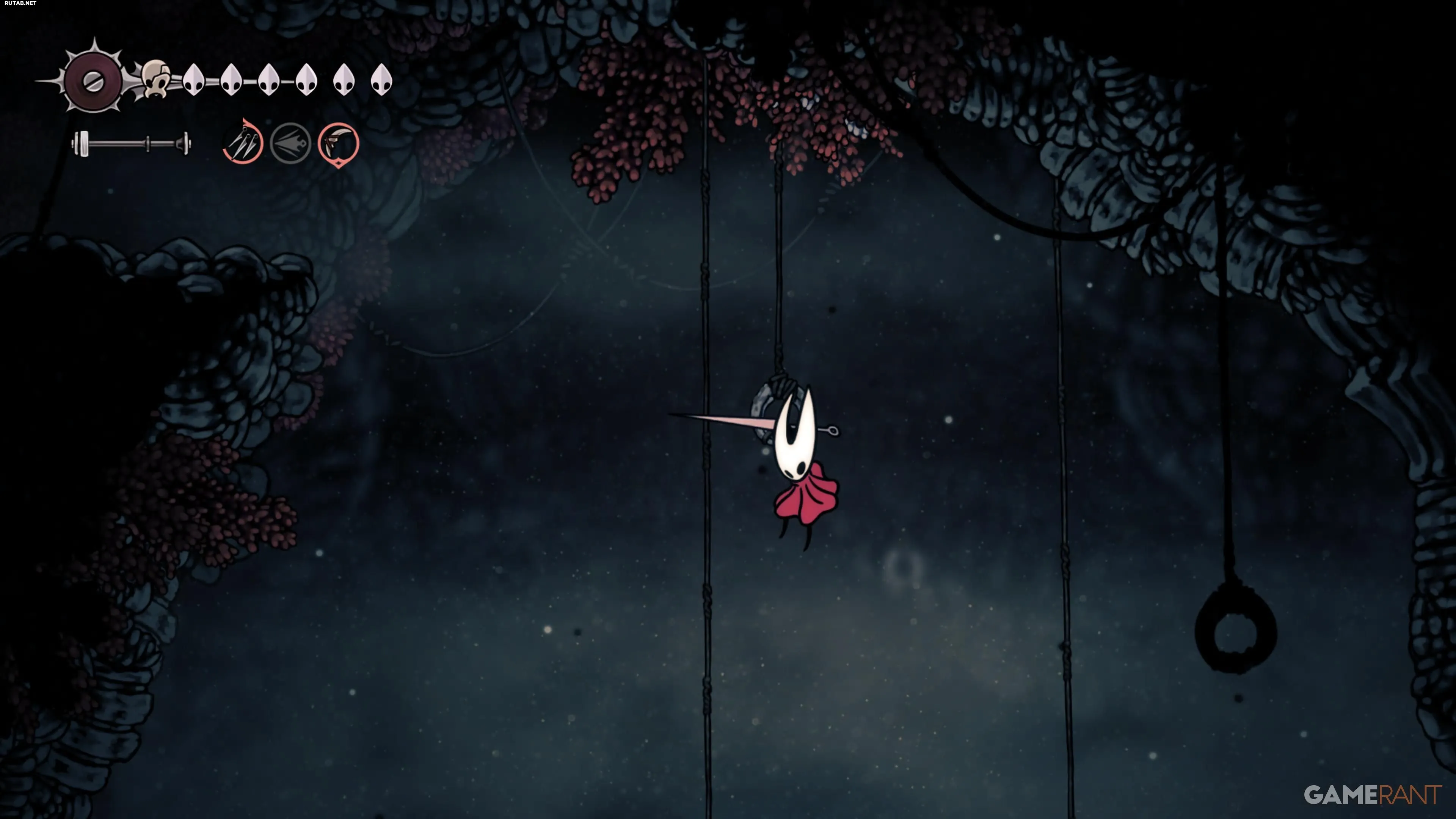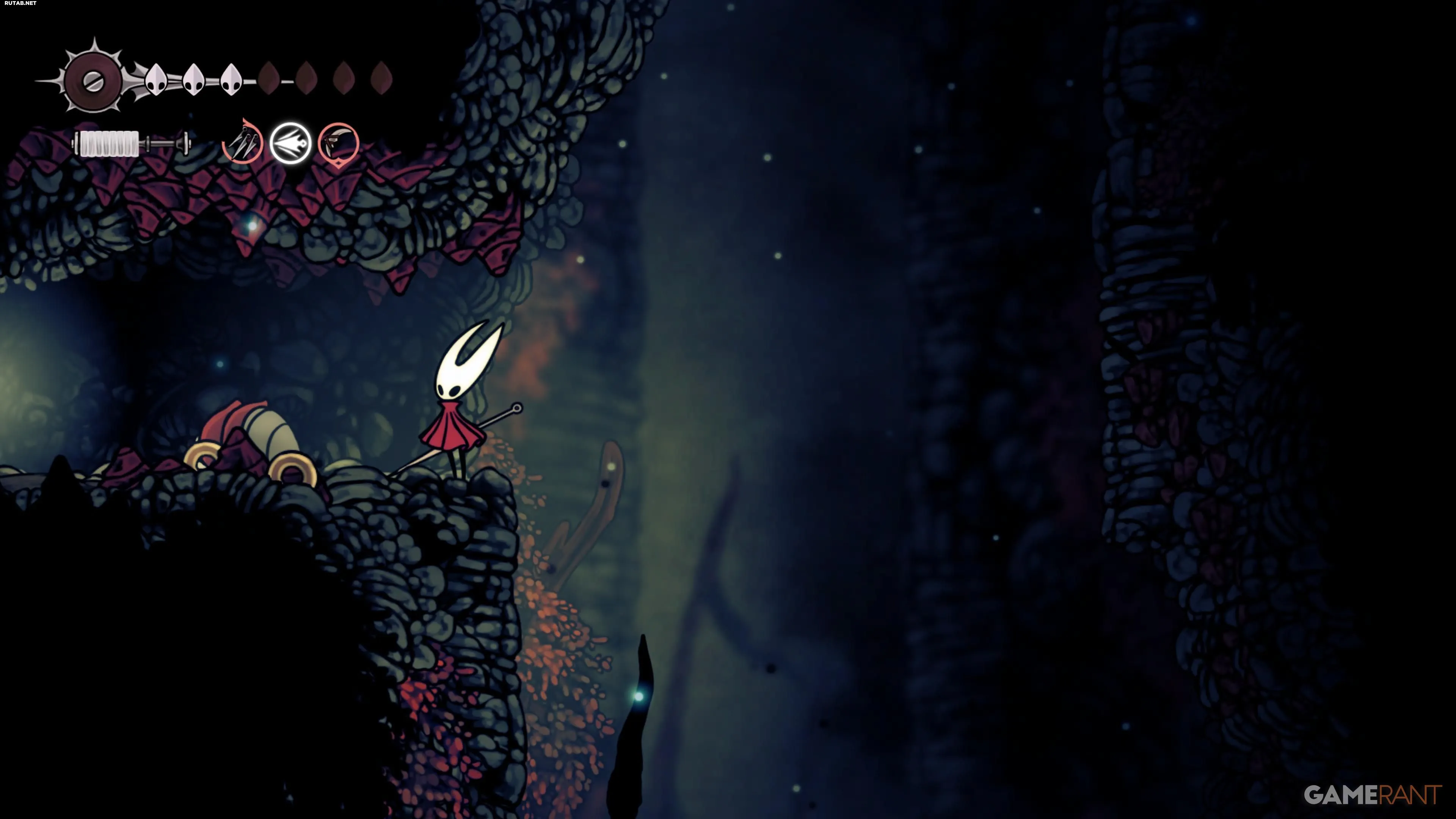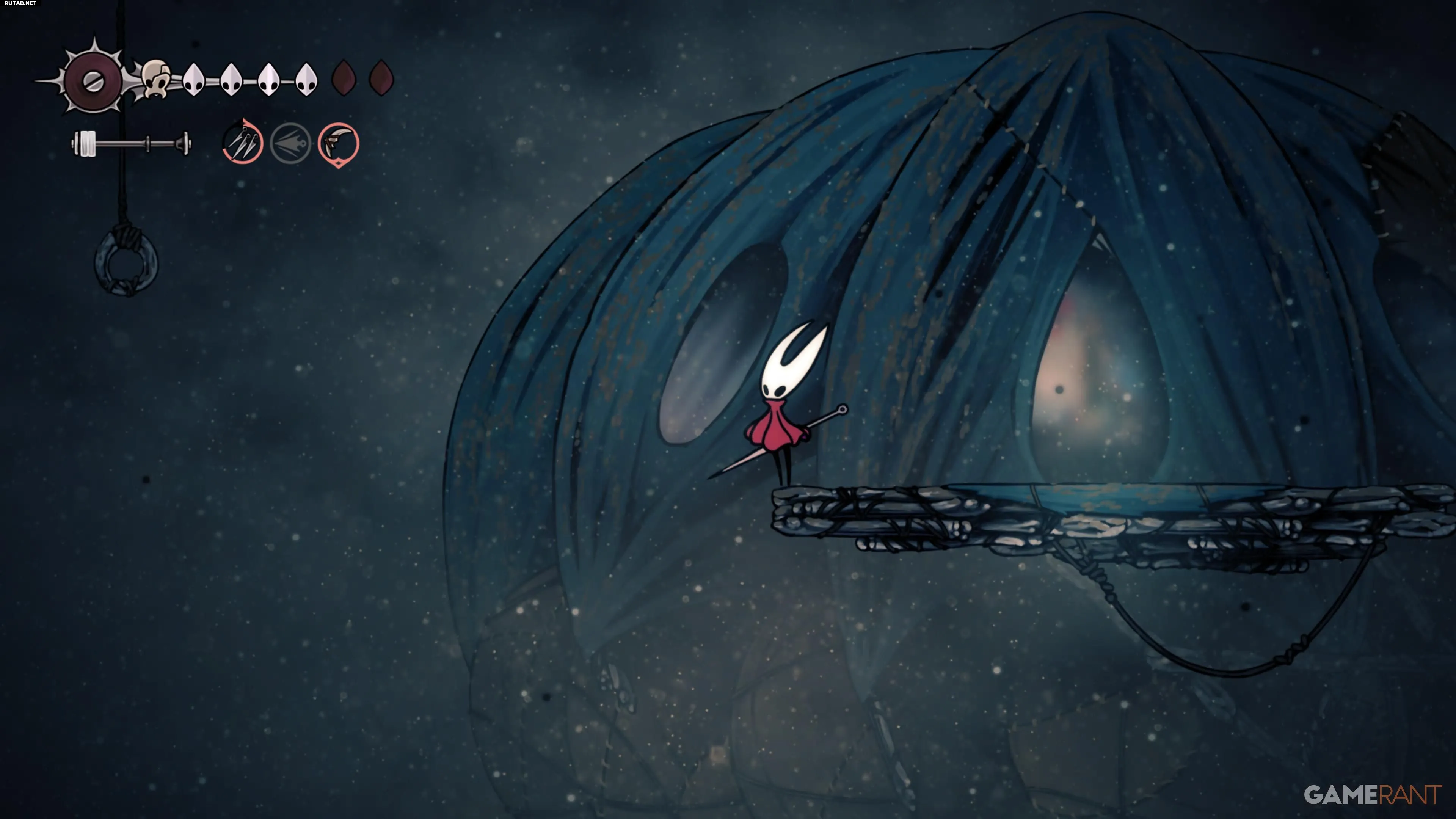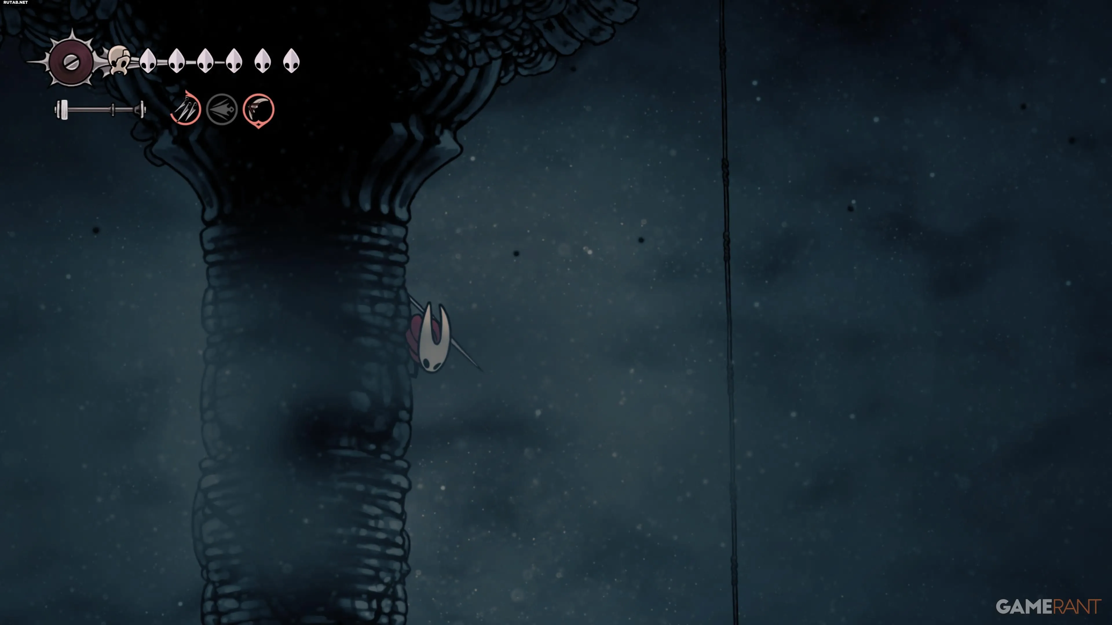 После победы над боссами идите налево от арены. В следующей секции можно пролететь направо и добраться до хижины, где живёт Булавочница. Поговорите с ней, чтобы получить способность «Сфокусированный удар», затем двигайтесь налево и найдите точку для броска гарпуном. Используйте «Цепкую нить», чтобы подняться вверх, и пройдите через проход в верхнем левом углу. Поднимайтесь дальше, остерегаясь жуков на стенах — их атаки отнимают две единицы здоровья. Продолжайте путь, и вы попадёте в Пески Карака.