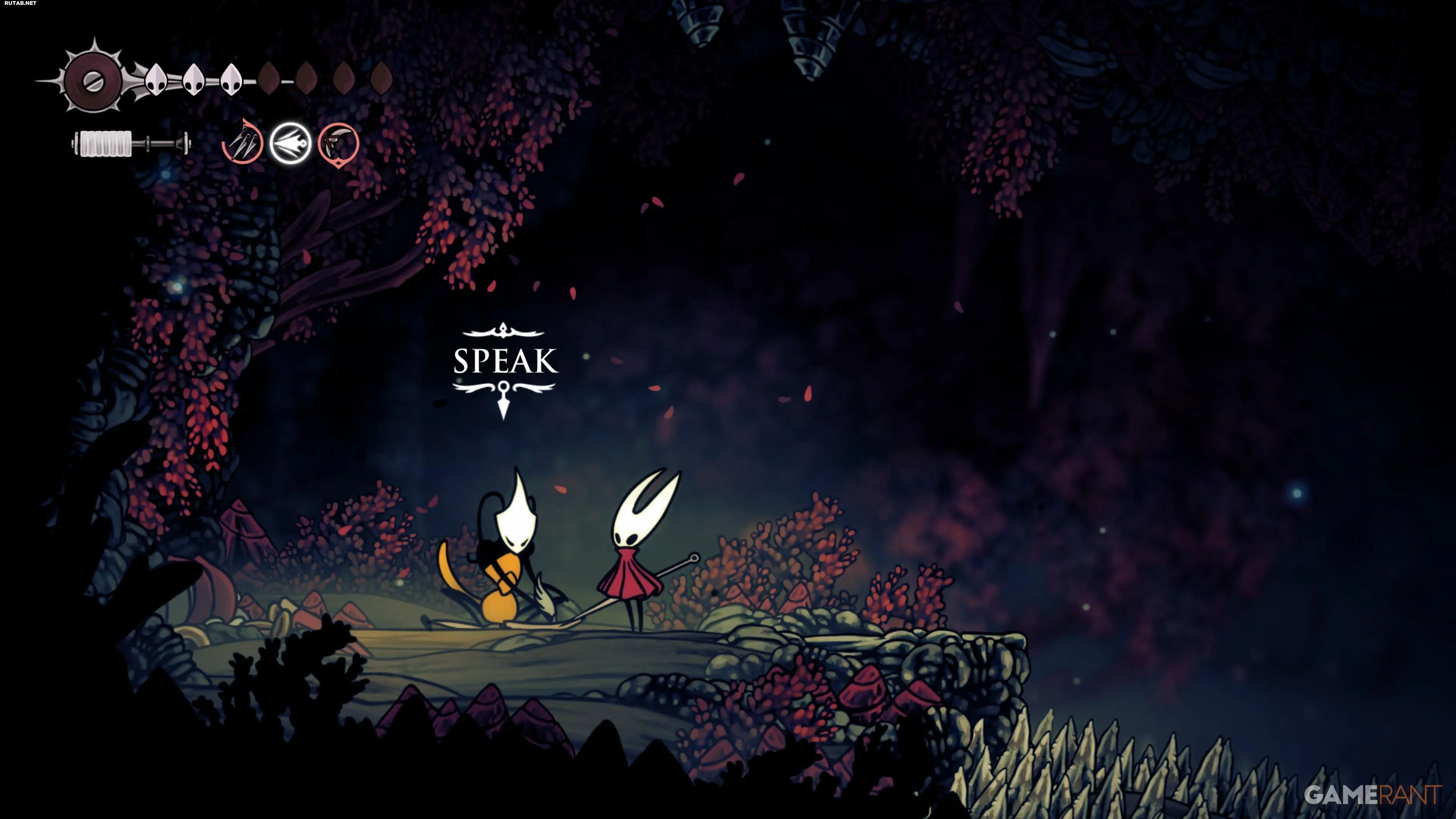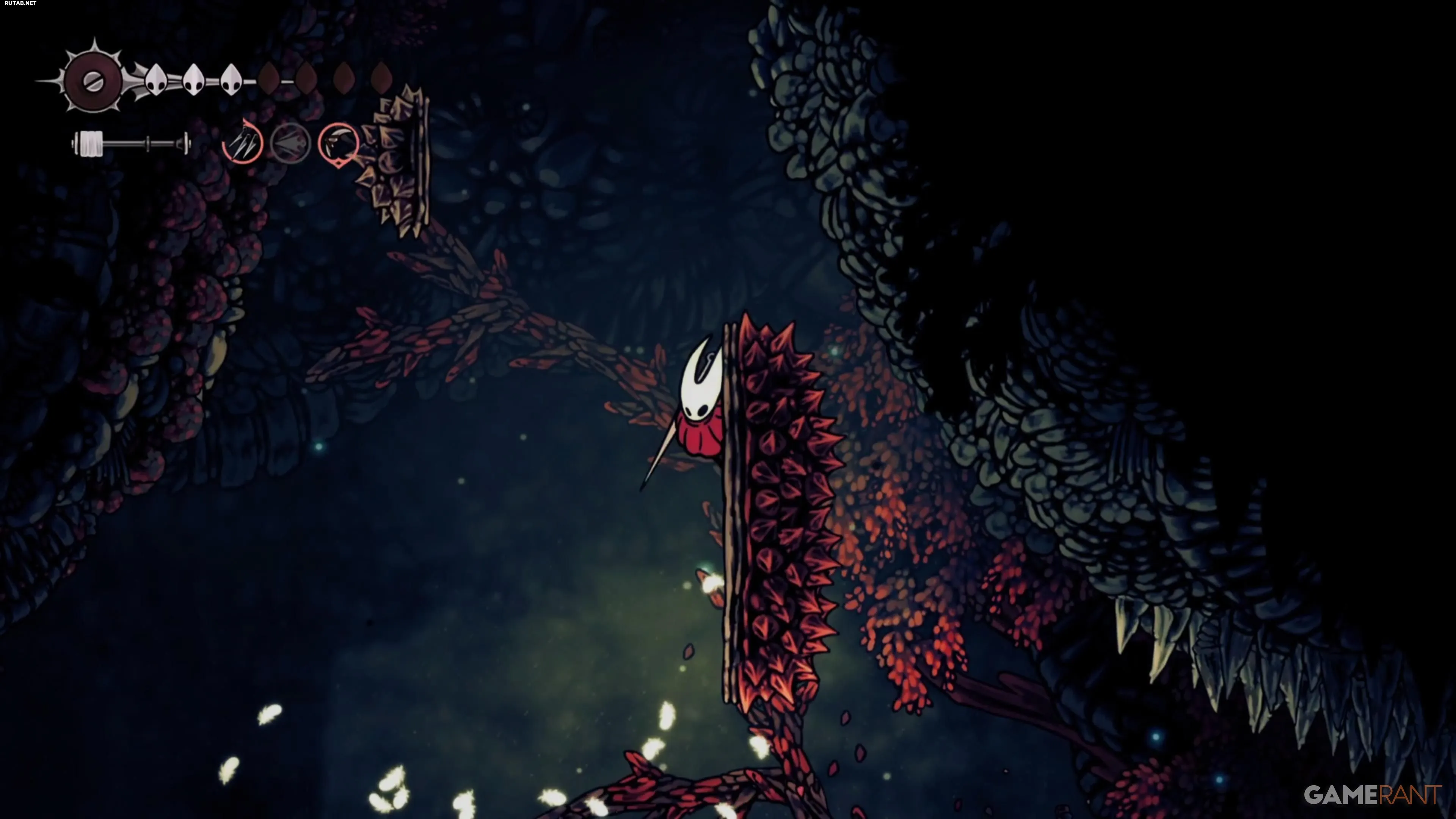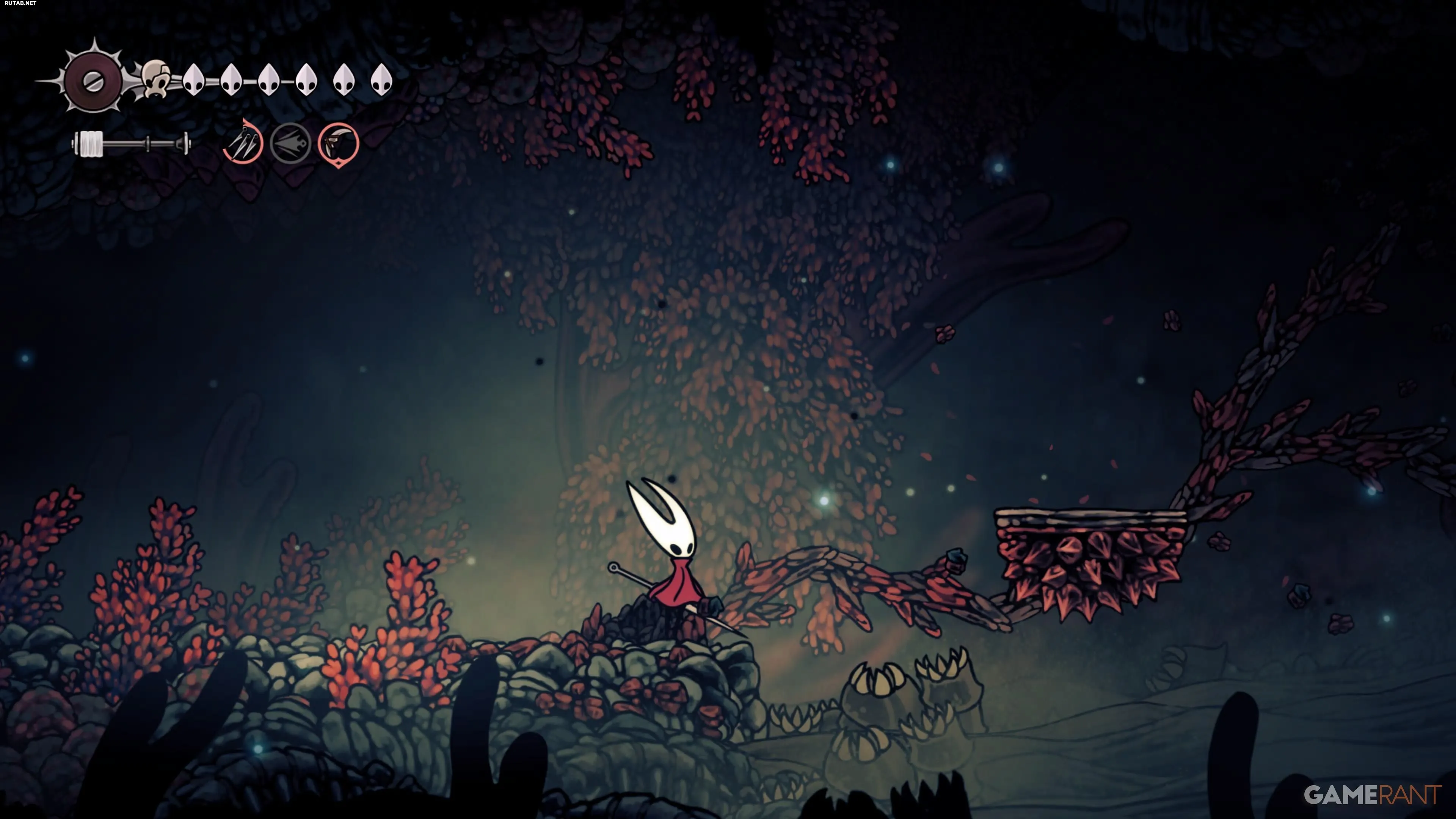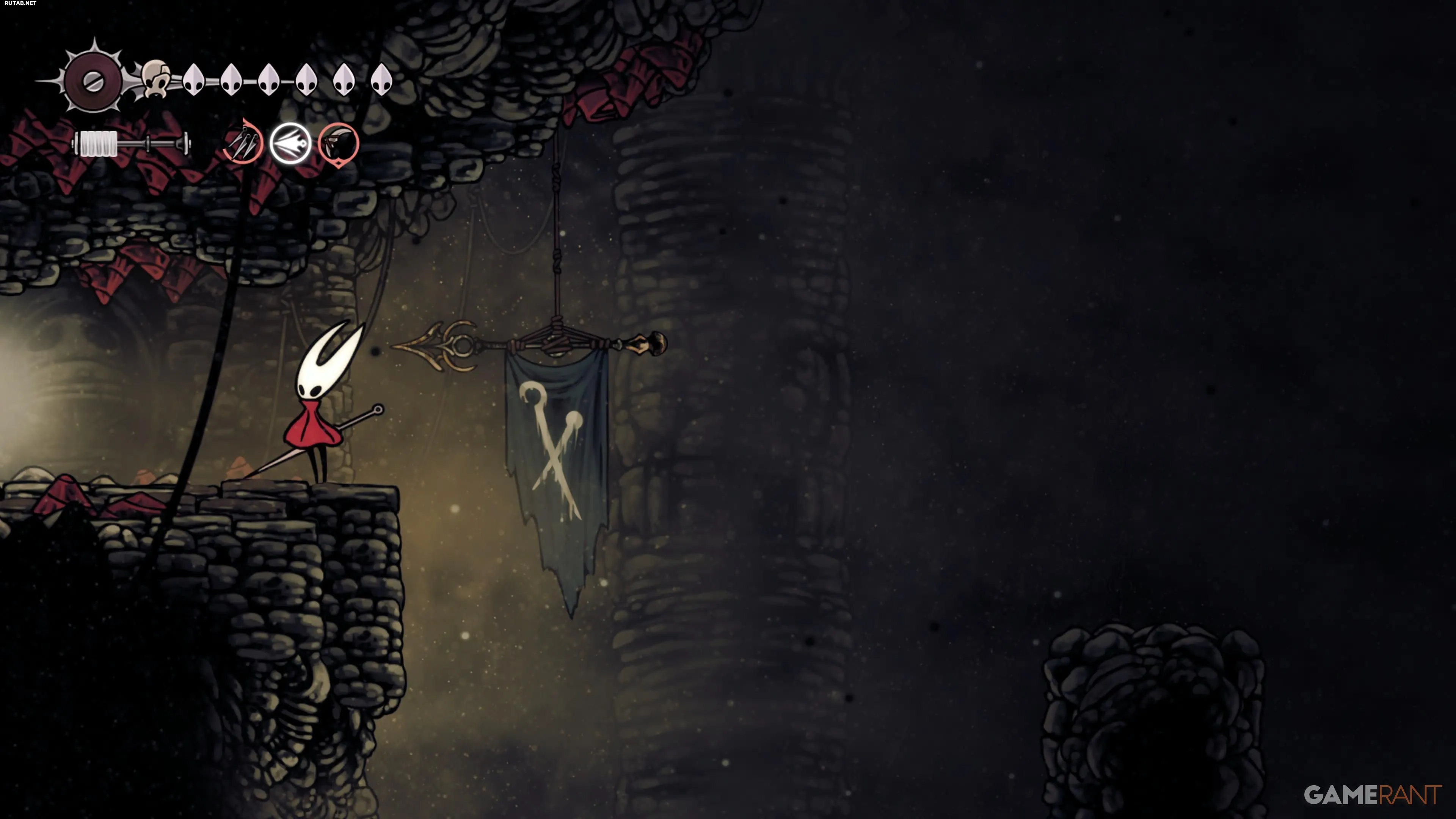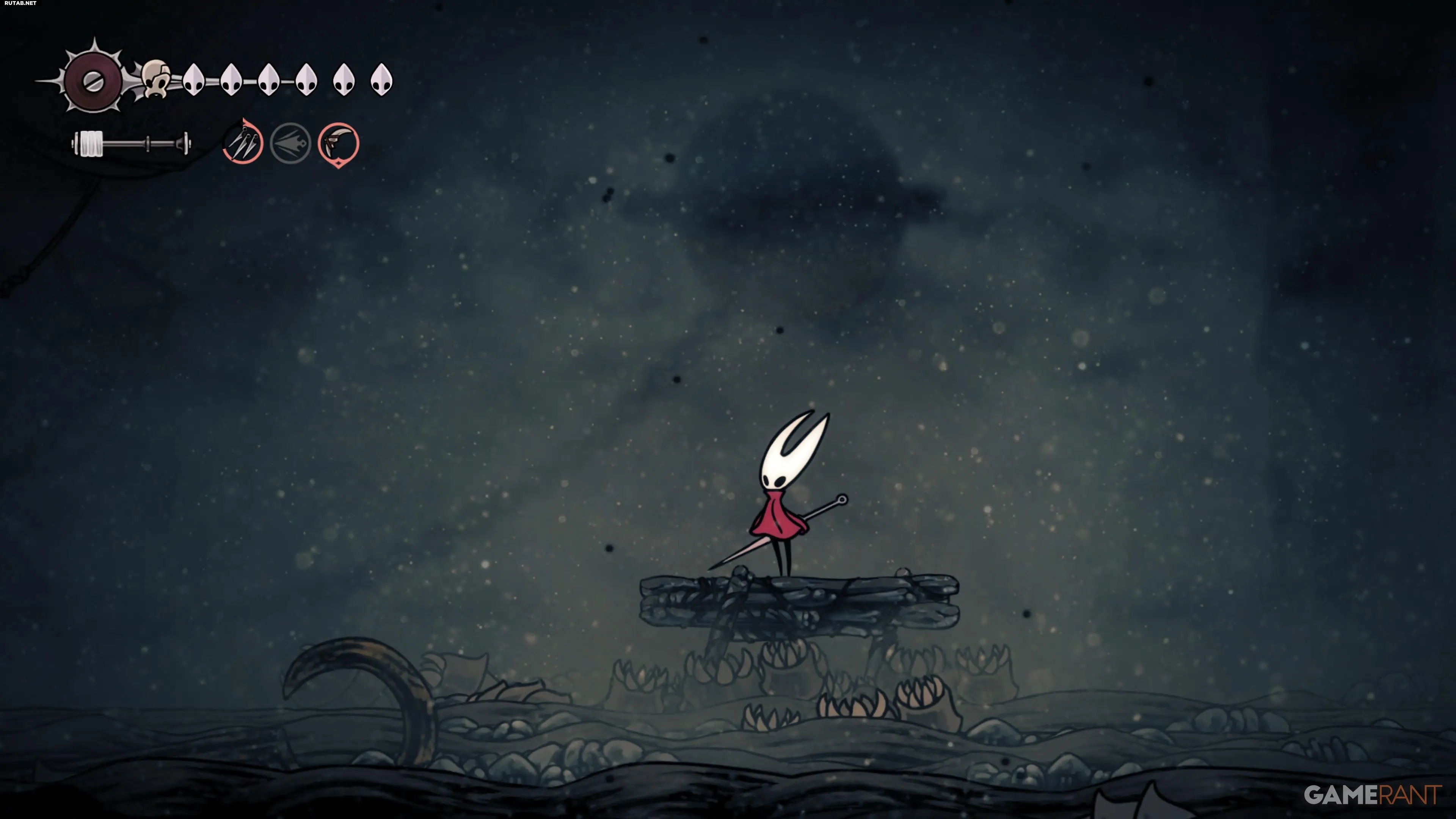 После победы над боссами идите налево от арены. В следующей секции можно пролететь направо и добраться до хижины, где живёт Булавочница. Поговорите с ней, чтобы получить способность «Сфокусированный удар», затем двигайтесь налево и найдите точку для броска гарпуном. Используйте «Цепкую нить», чтобы подняться вверх, и пройдите через проход в верхнем левом углу. Поднимайтесь дальше, остерегаясь жуков на стенах — их атаки отнимают две единицы здоровья. Продолжайте путь, и вы попадёте в Пески Карака.