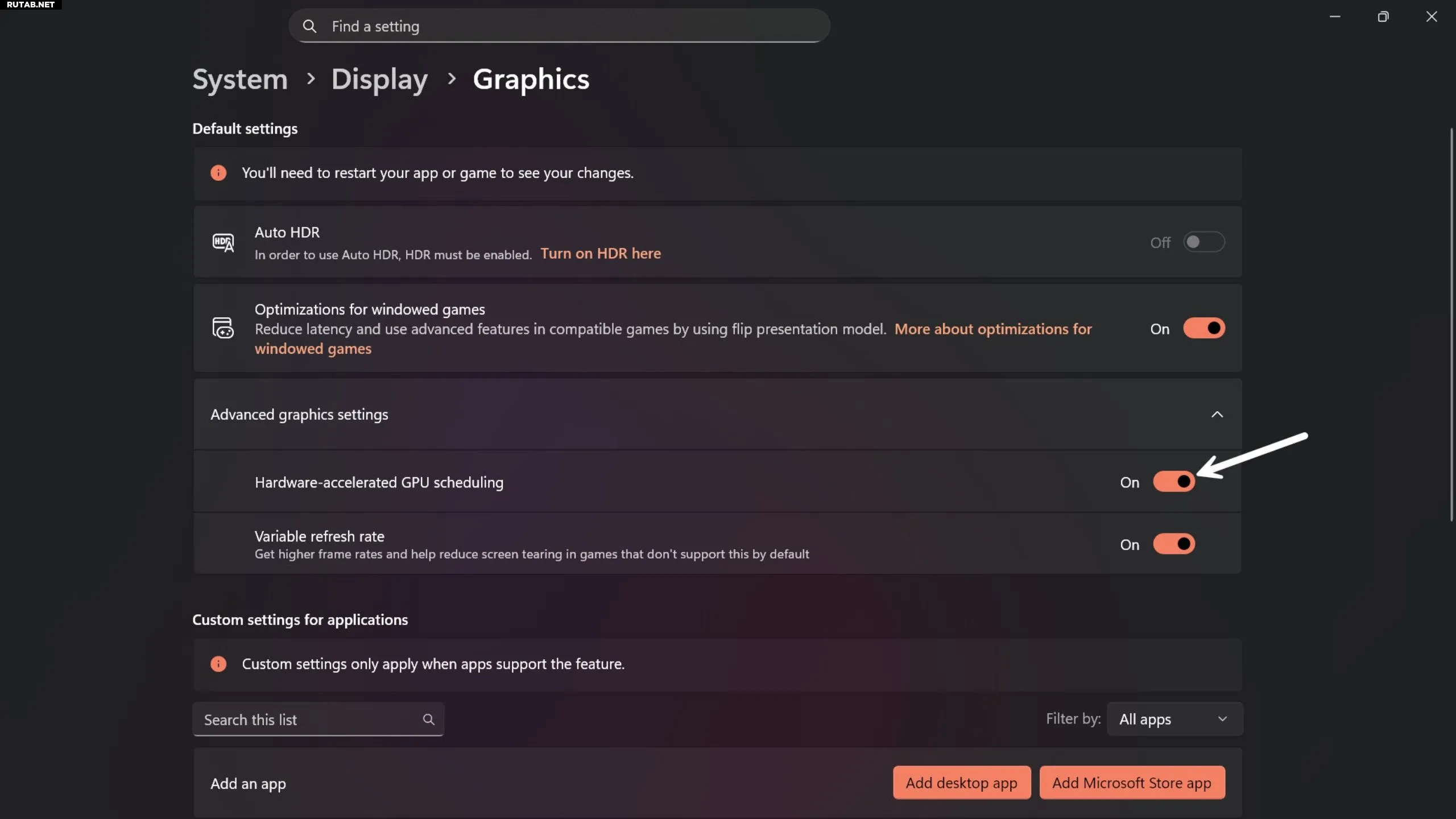 - Разверните вкладку «Дополнительные параметры графики» и отключите «Аппаратное ускорение GPU»