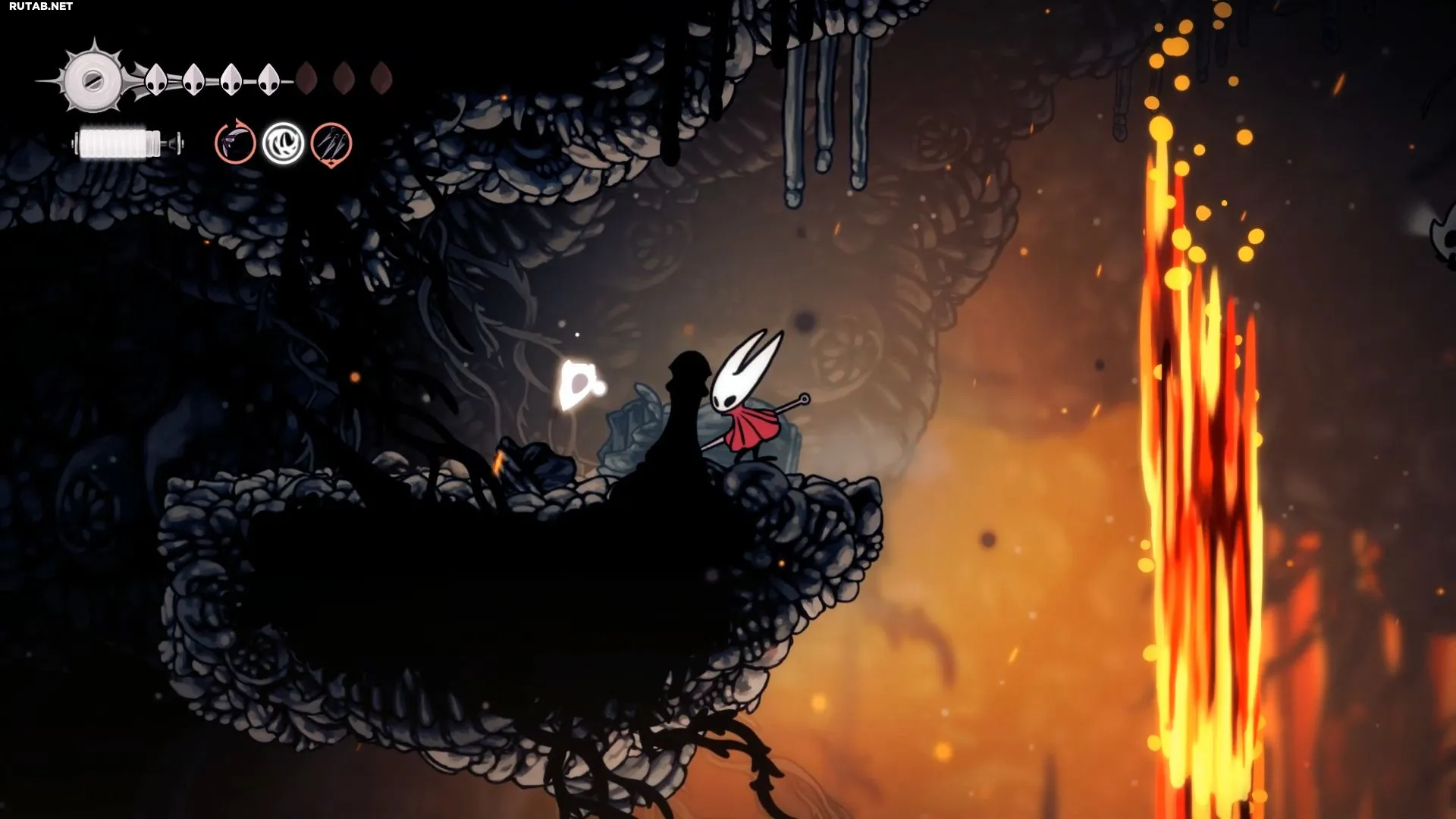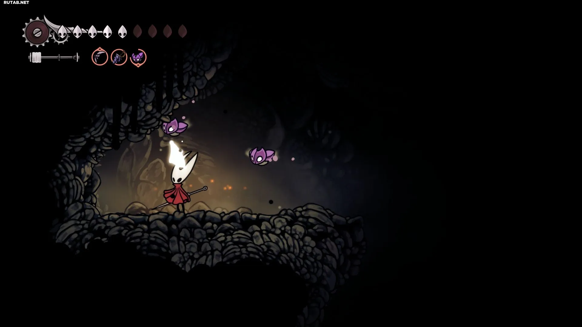 Продолжайте делать то же самое внутри, пока Хорнет не сможет добраться до взрывающегося камня на потолке. Используйте поток воздуха для подъёма, затем ударьте по камню, чтобы он упал.