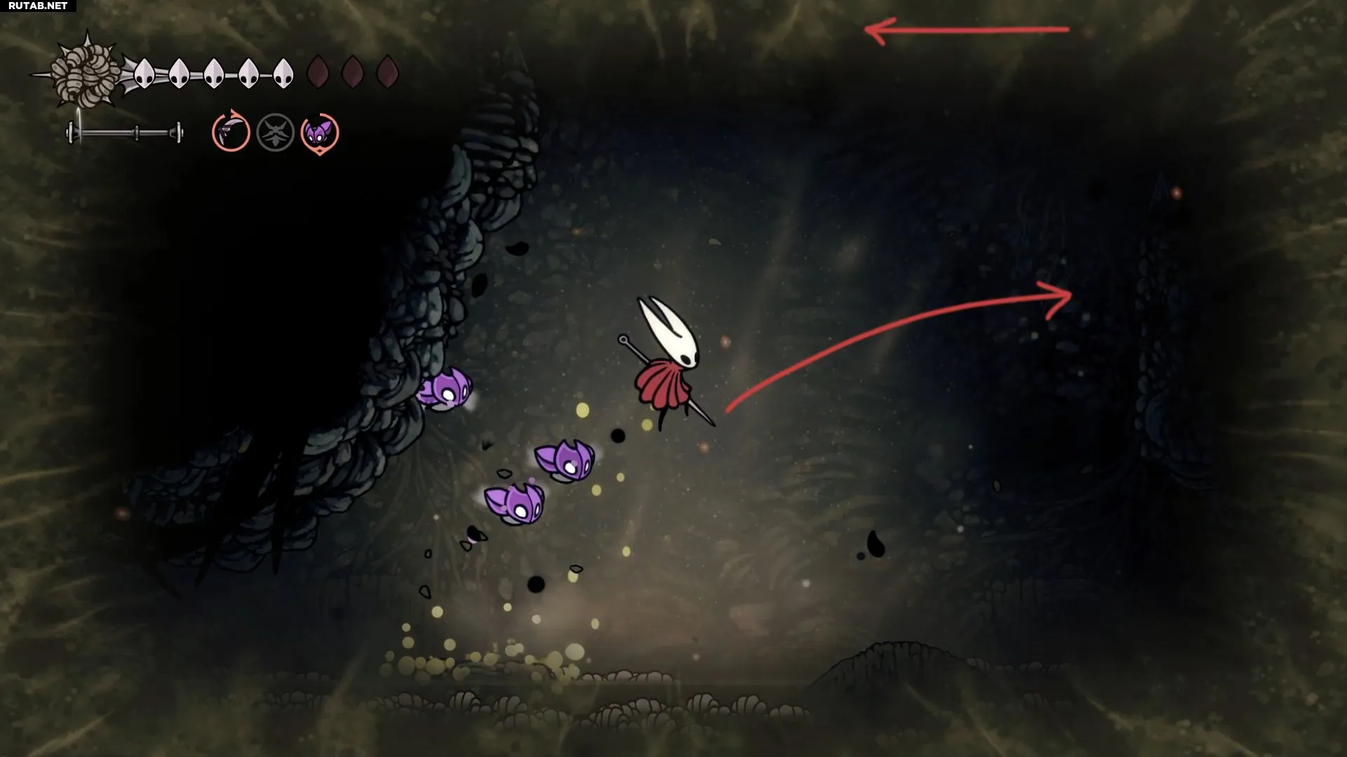 После телепорта на нижнюю сторону Ткачедома Атла запрыгните на стену с помощью Двойного прыжка в Silksong и продолжайте цепляться, пока не найдёте путь направо. Идите направо, затем вниз.
