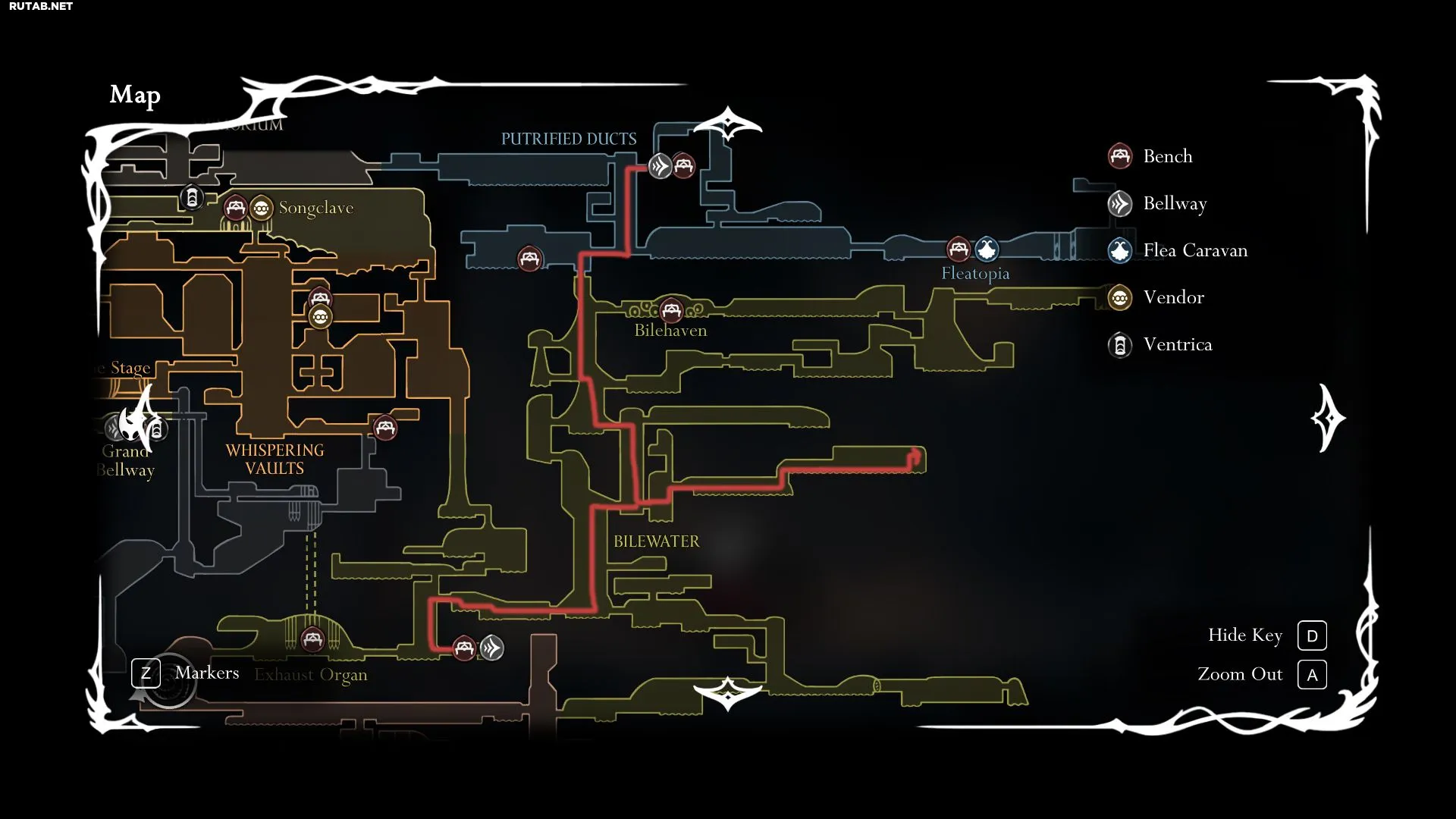 С северной стороны Гнилых стоков или южного Звонкого пути Желчноводья найдите проход в вертикальную комнату прямо над словом «Желчноводье» на карте.