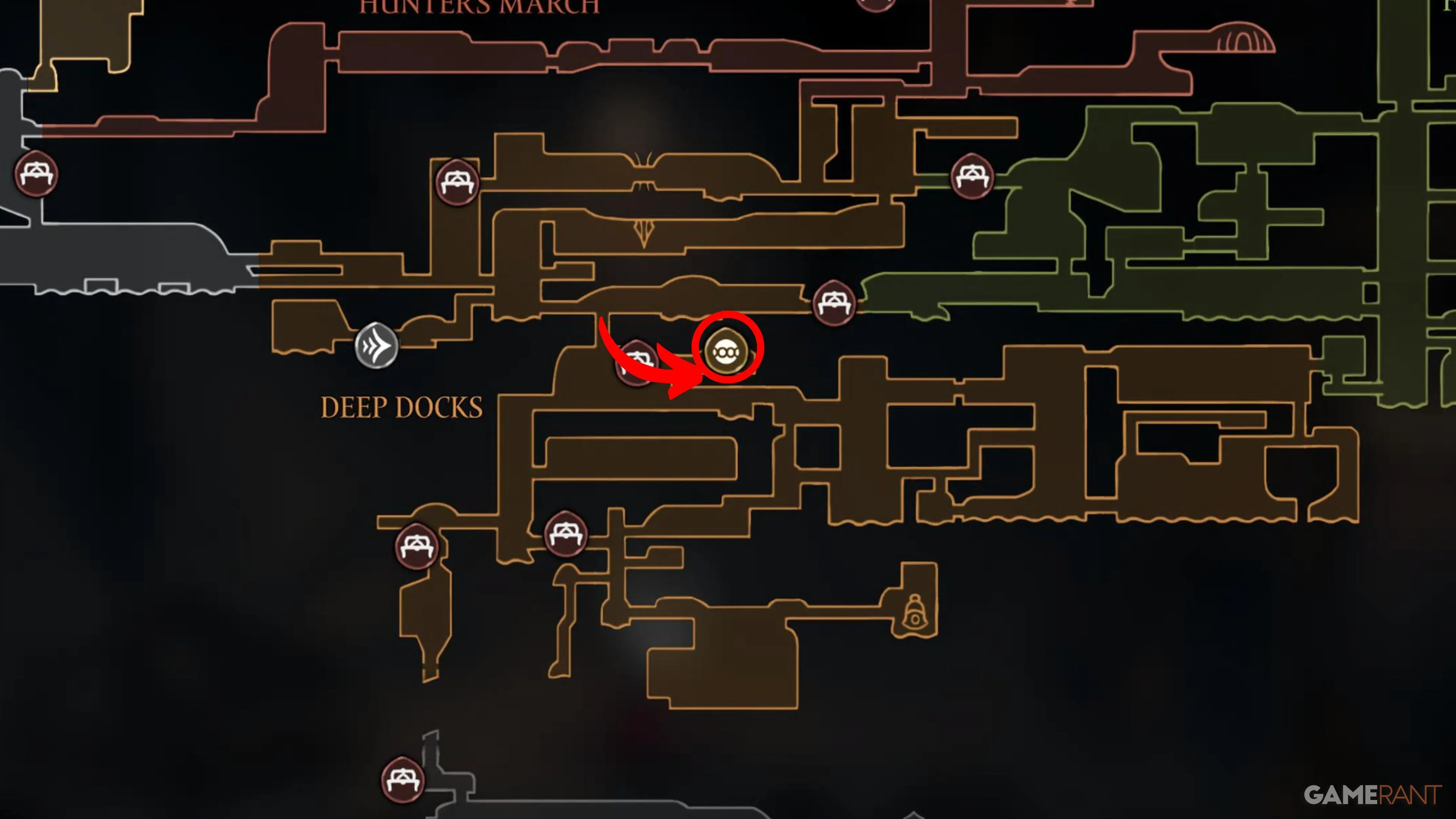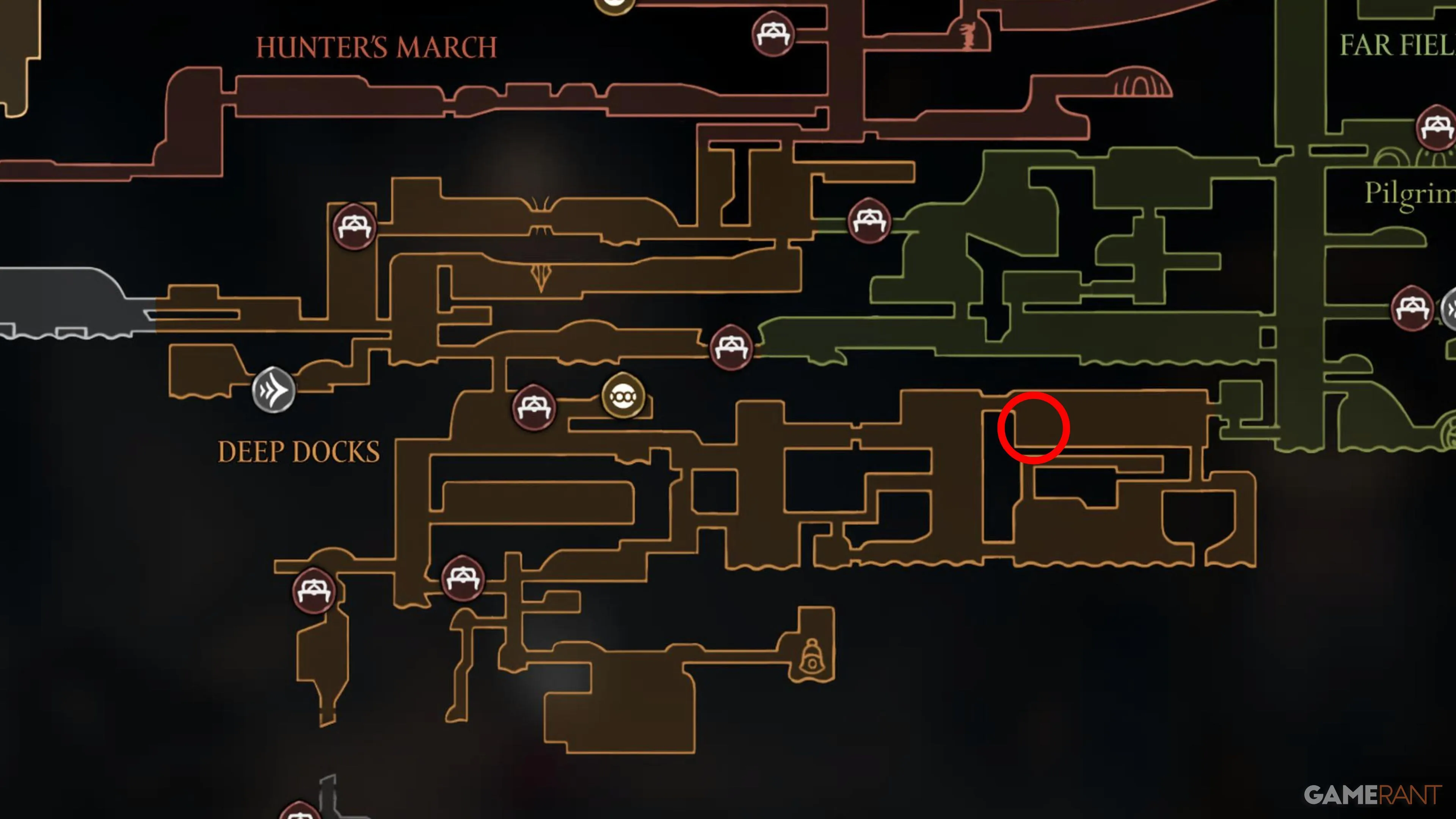 Глубокие доки | От NPC Дочь спуститесь вниз и направо, чтобы найти тяжёлую дверь, для открытия которой требуется Простой ключ. Исследуйте область впереди, пока не достигнете комнаты с запертыми воротами и кольцом рядом. Для их открытия требуется способность Цепкая нить, но она не нужна. Просто развернитесь, и слева в комнате будет блокировка, которую можно разрушить, чтобы попасть в маленькую комнату с металлом. |