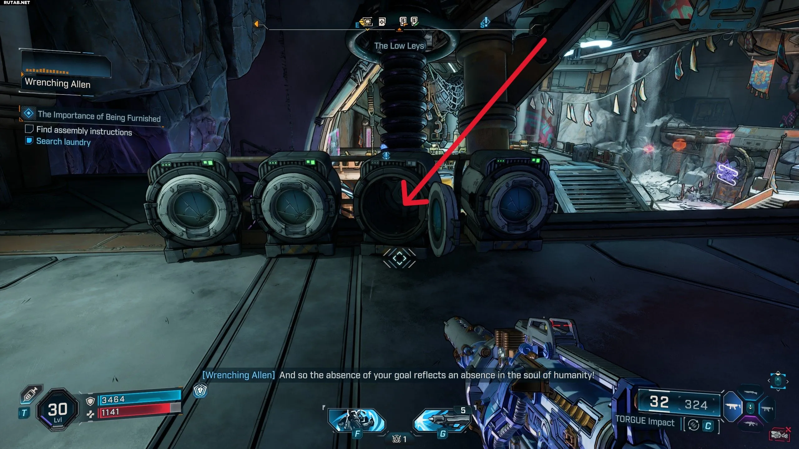 - «Поискать в белье» — отправиться в левые верхние комнаты штаба Огеров и открыть третью стиральную машину слева.
