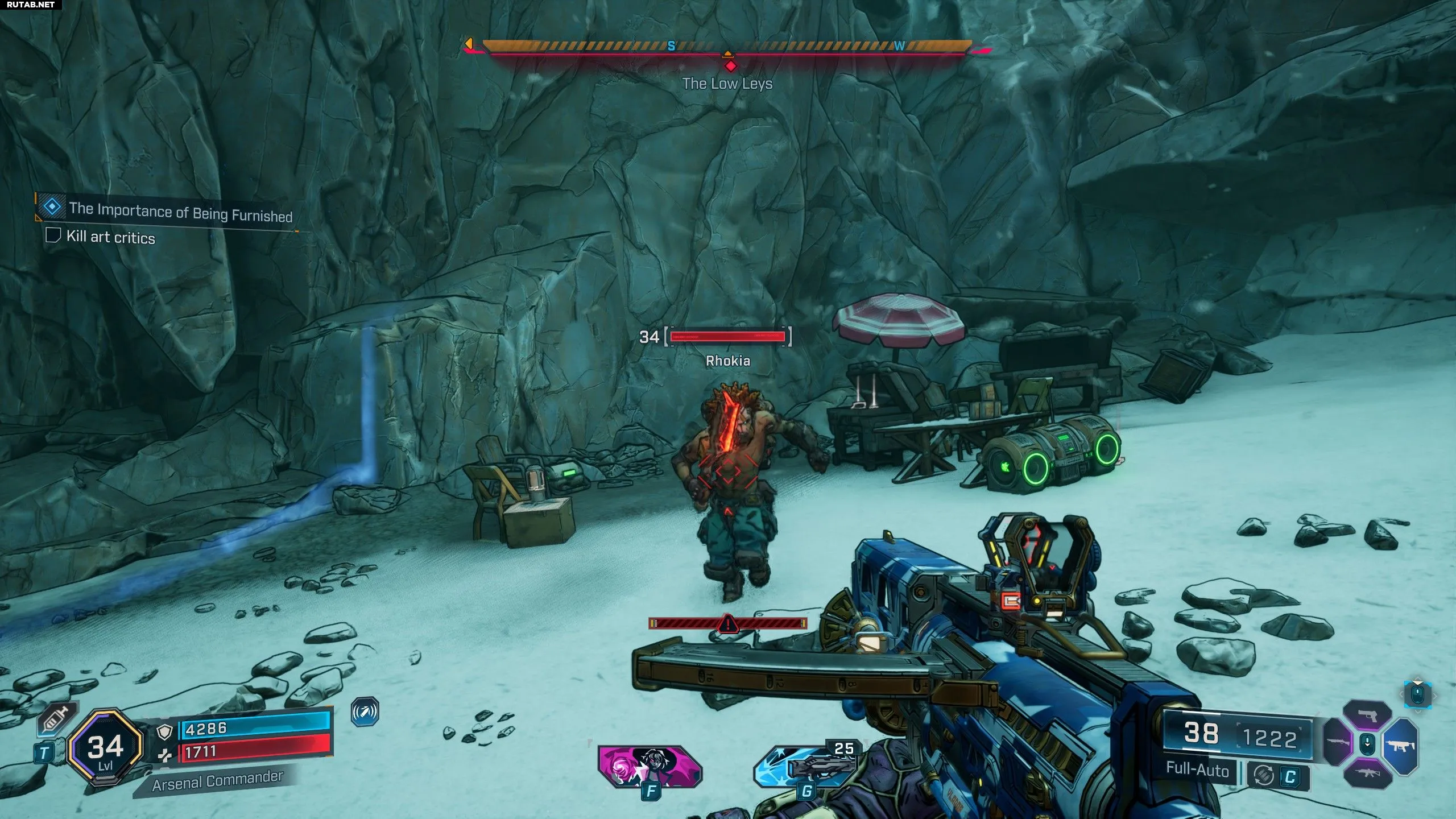 После обыска гриля вас прервёт Рокия — Риппер, который также является критиком творчества Аллена. Рокия спустится из пещеры над грилем для боя с Охотниками за Убежищами, но к нему должны присоединиться союзники. Если появился только Рокия, выйдите в главное меню и вернитесь в локацию, повторяйте, пока не убьёте 4–5 врагов, включая Рокию.