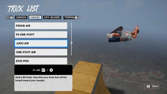 - На вершине выполните кикфлип: при классическом управлении — правый стик вниз, затем вверх и влево по диагонали; при упрощённом — сразу вверх-влево.