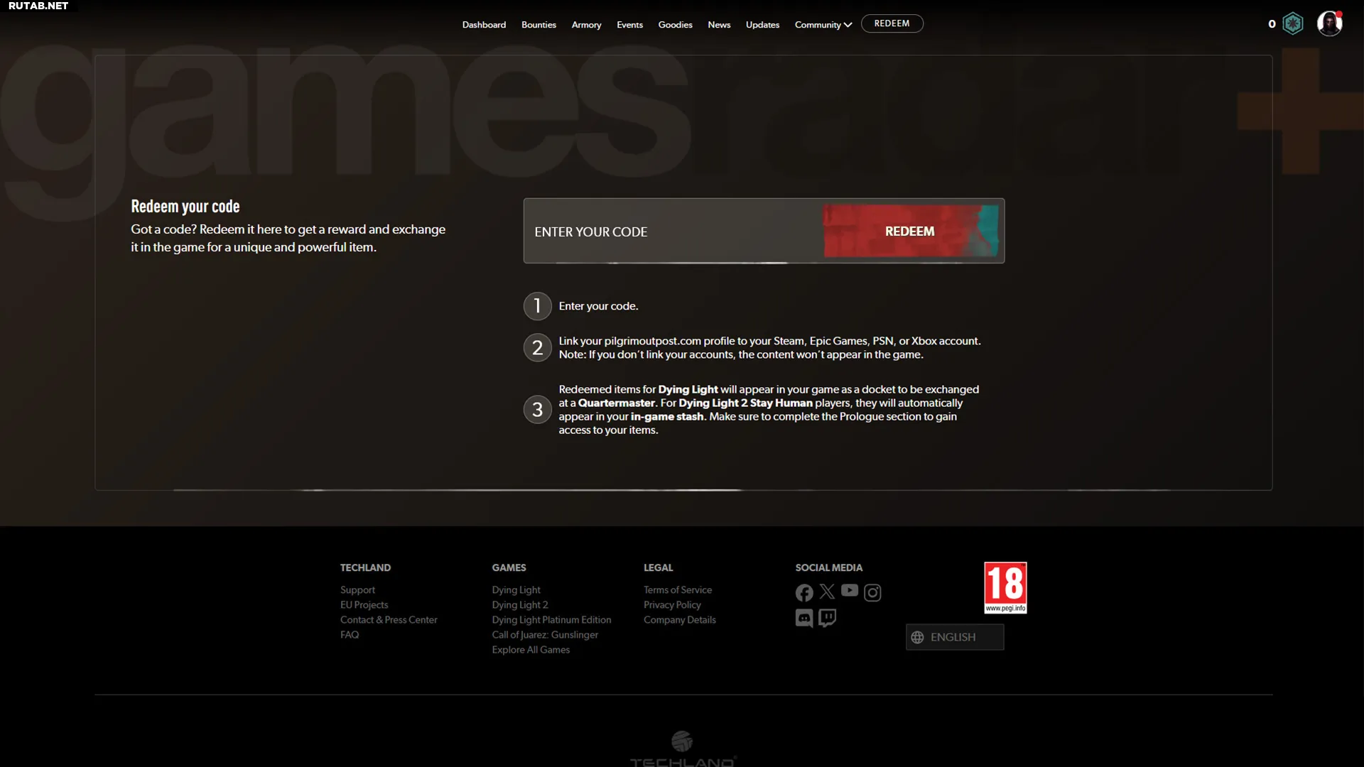 Чтобы получить бесплатные коды Docket, сначала нужно создать личный аккаунт на сайте Pilgrim Outpost от Techland и подключить его к платформенному аккаунту, на котором вы играете. После этого нажмите кнопку «REDEEM» в верхней части страницы, введите или скопируйте коды из списка выше и нажмите «REDEEM» для активации.