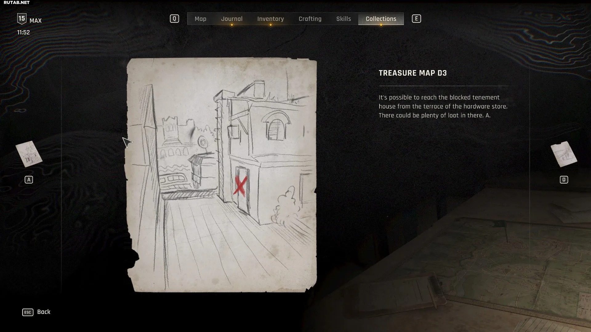 Откройте главное меню → вкладка «Коллекции» → «Охоты за сокровищами» → выберите карту D3. В описании указано: «До заблокированного многоквартирного дома можно добраться с террасы хозяйственного магазина. Там может быть много добычи. А.»