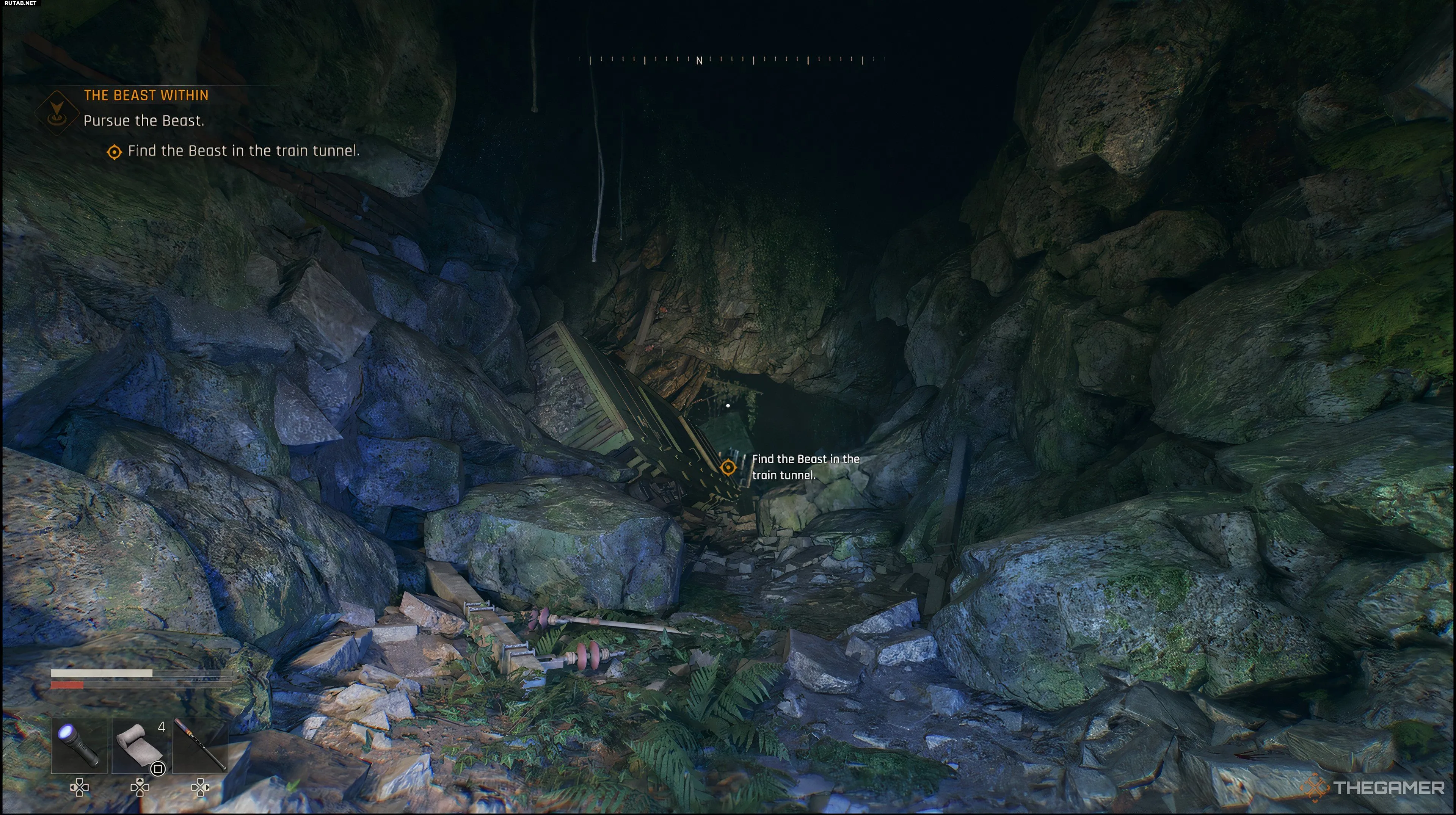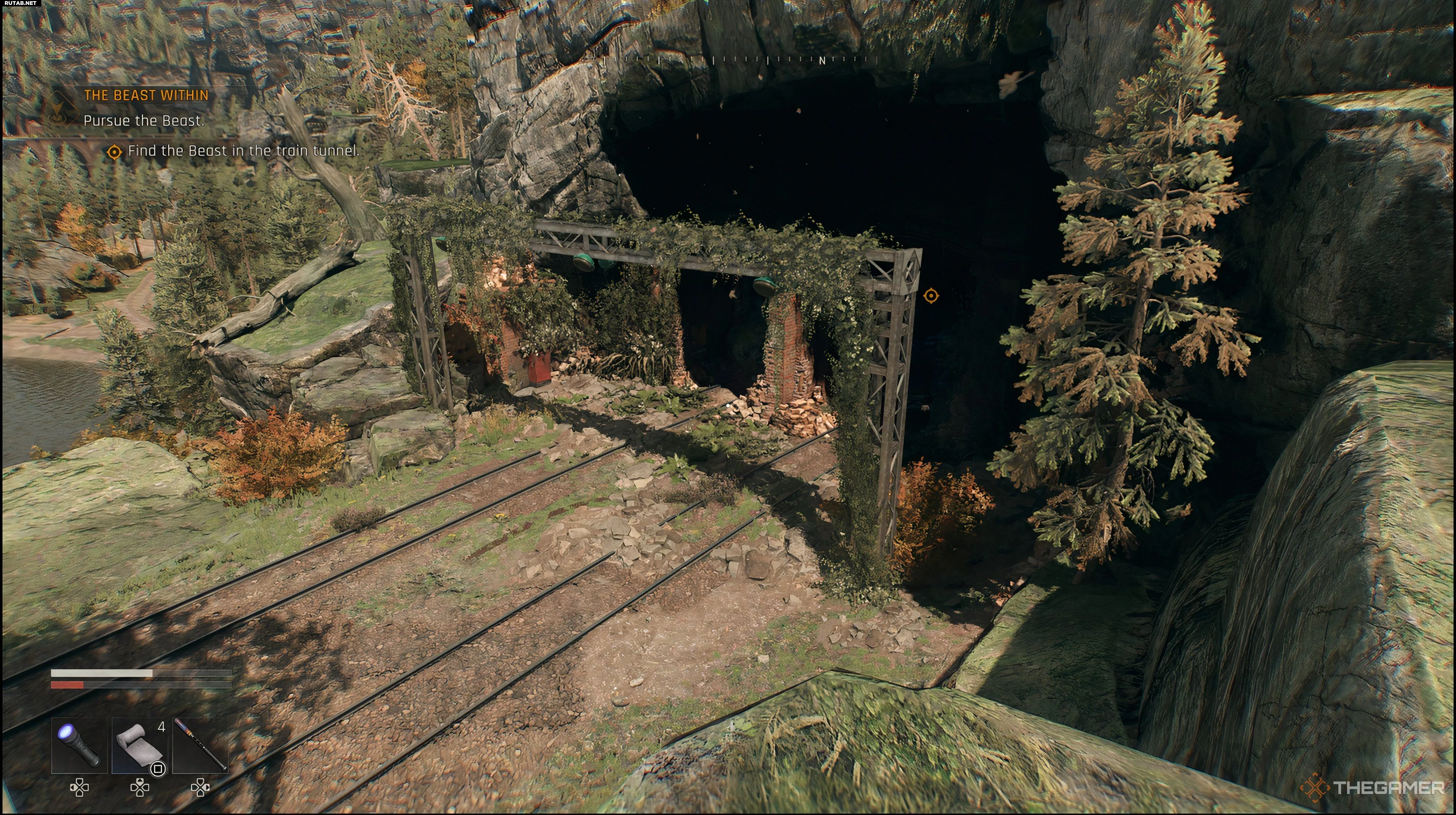 Следуя по путям, вы окажетесь в пещероподобной структуре. С помощью Чувства выжившего можно обнаружить тропу, ведущую к двери с телом перед ней. Взаимодействуйте с телом, чтобы открыть дверь, после чего попадете в большое помещение.