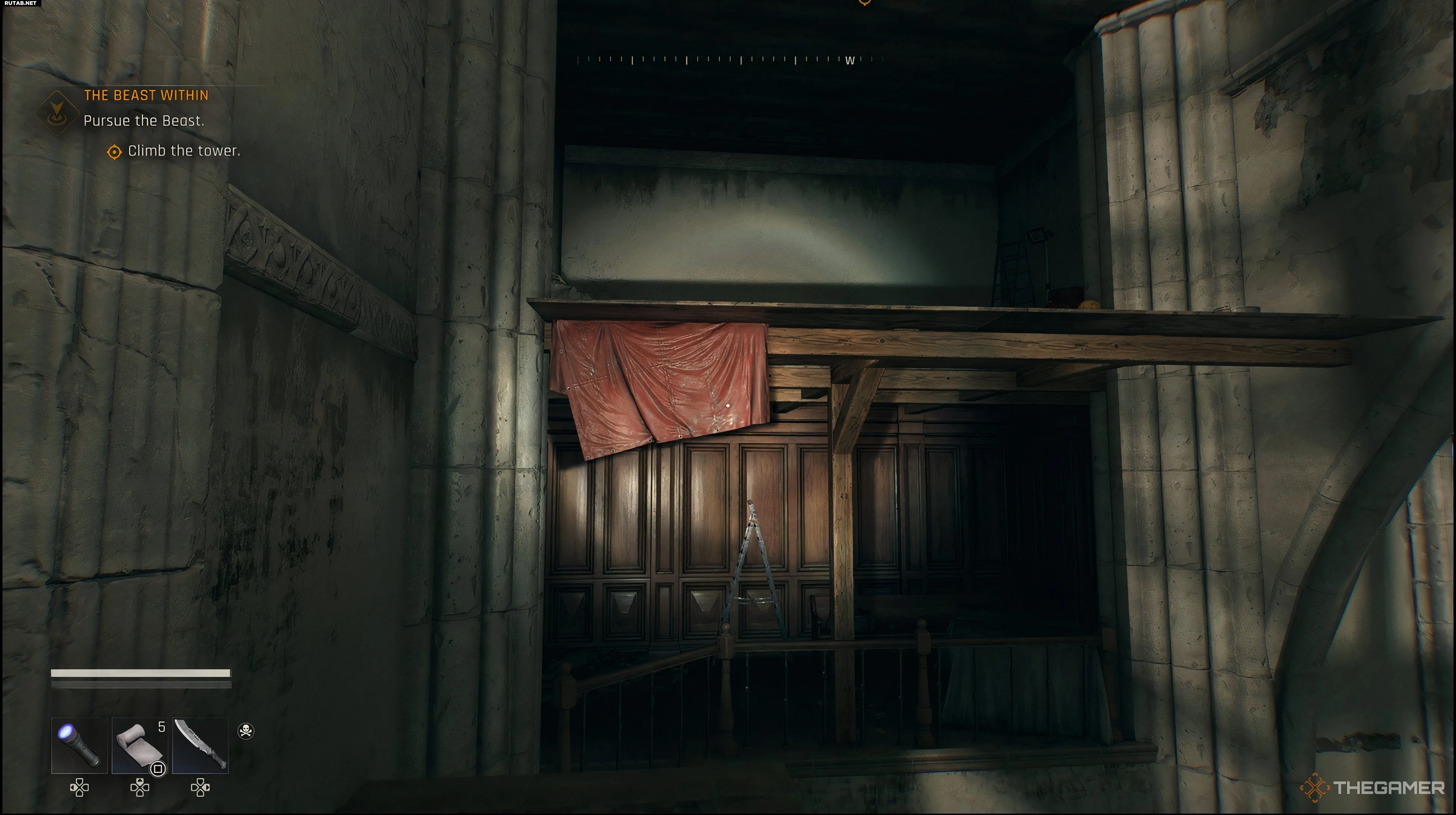 После завершения кат-сцены найдите деревянную платформу рядом с большой статуей ангела. Забравшись на неё, подпрыгните, чтобы ухватиться за выступ. Двигайтесь влево вдоль круглого карниза, пока не достигнете пролома в стене.