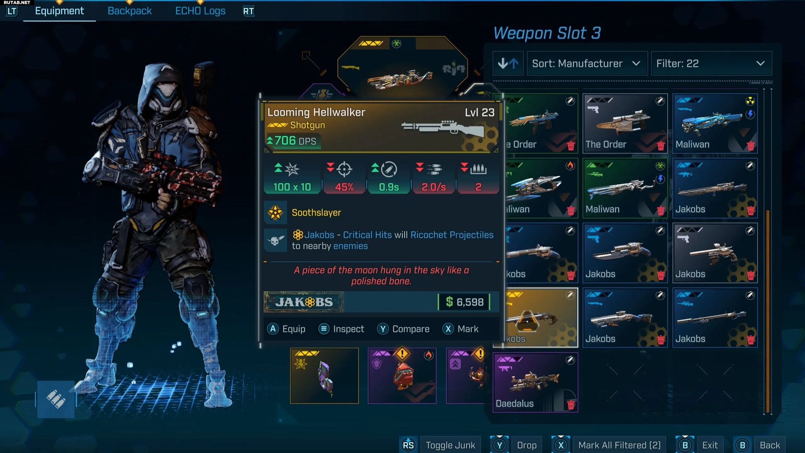 Hellwalker — это двуствольный дробовик производства Джейкобс, который выстреливает дробью в форме пентаграммы, сокрушая пораженных врагов. При попадании по критическим зонам дробинки также рикошетят от врагов, поражая других поблизости. Когда вы достигнете максимального уровня, рекомендуется снова заняться фармом Hellwalker, чтобы получить самую мощную версию оружия.